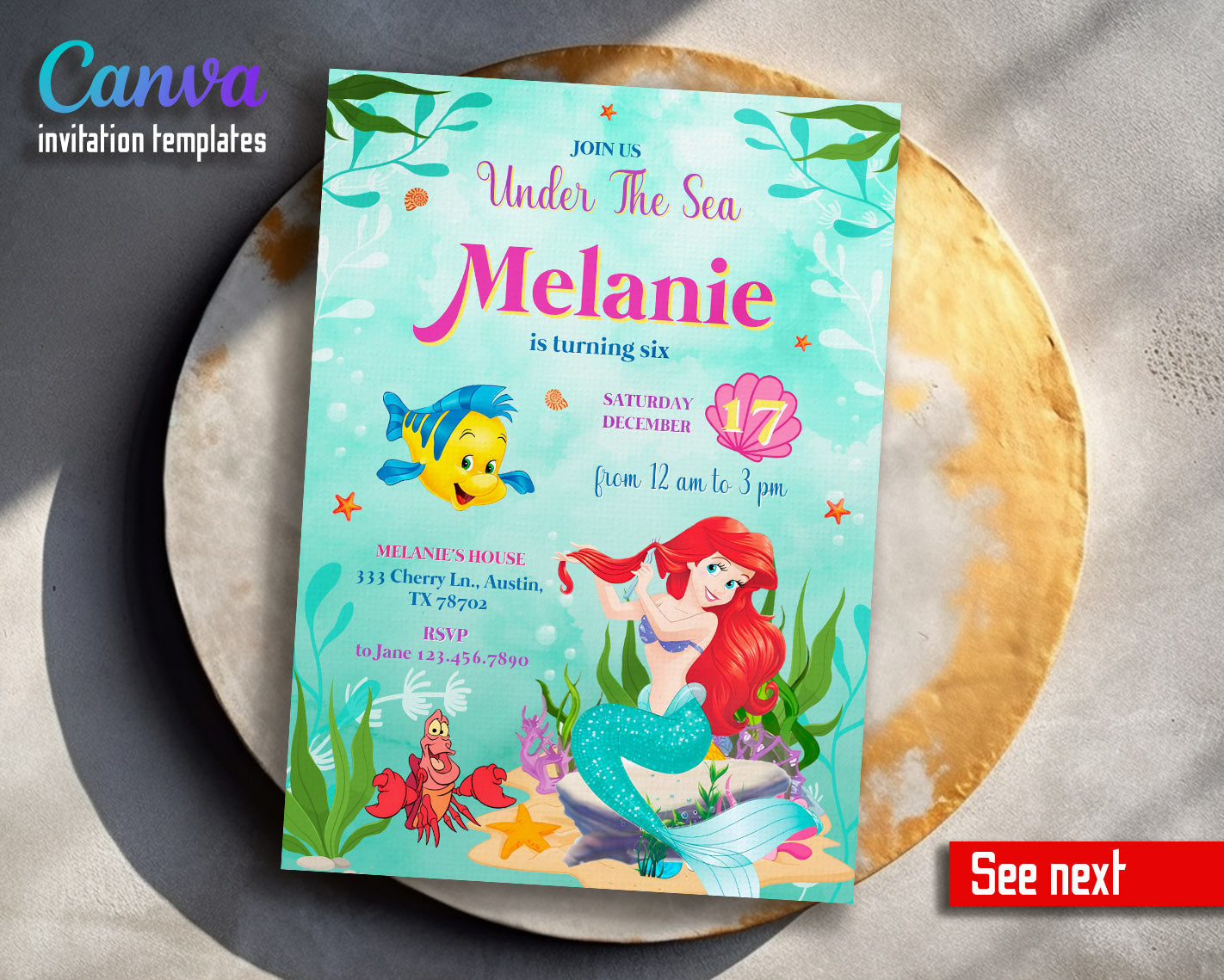 Printable Editable customizable Ariel The Little Mermaid birthday party invitation digital template. Instant download invite.