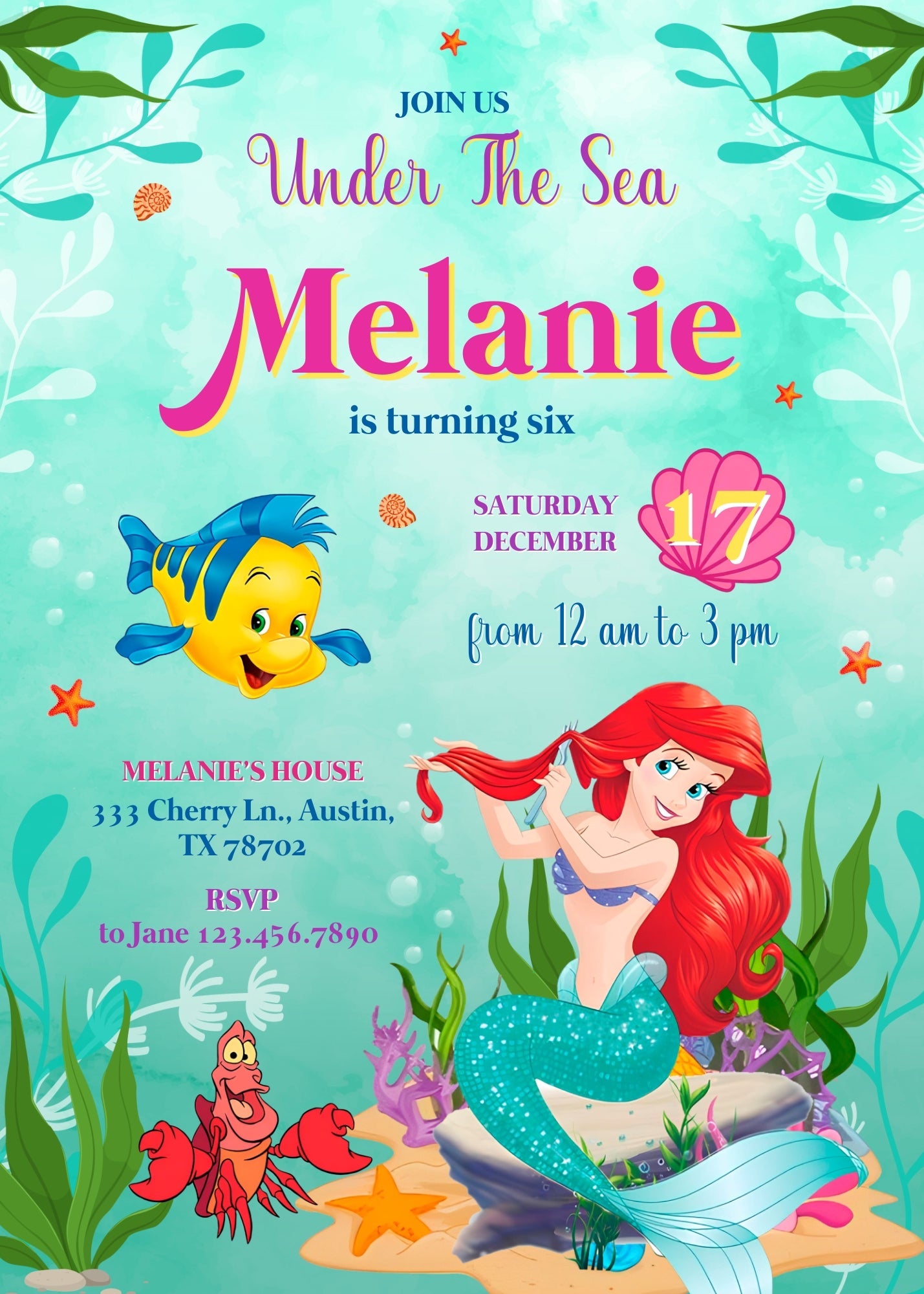 Related Tags: princess invitation, disney birthday, under sea invite, mermaid invitation, ariel party, ariel invite, disneyland, birthday invitation, printable invitation, little mermaid party, ariel invitation, girl birthday, disney princess