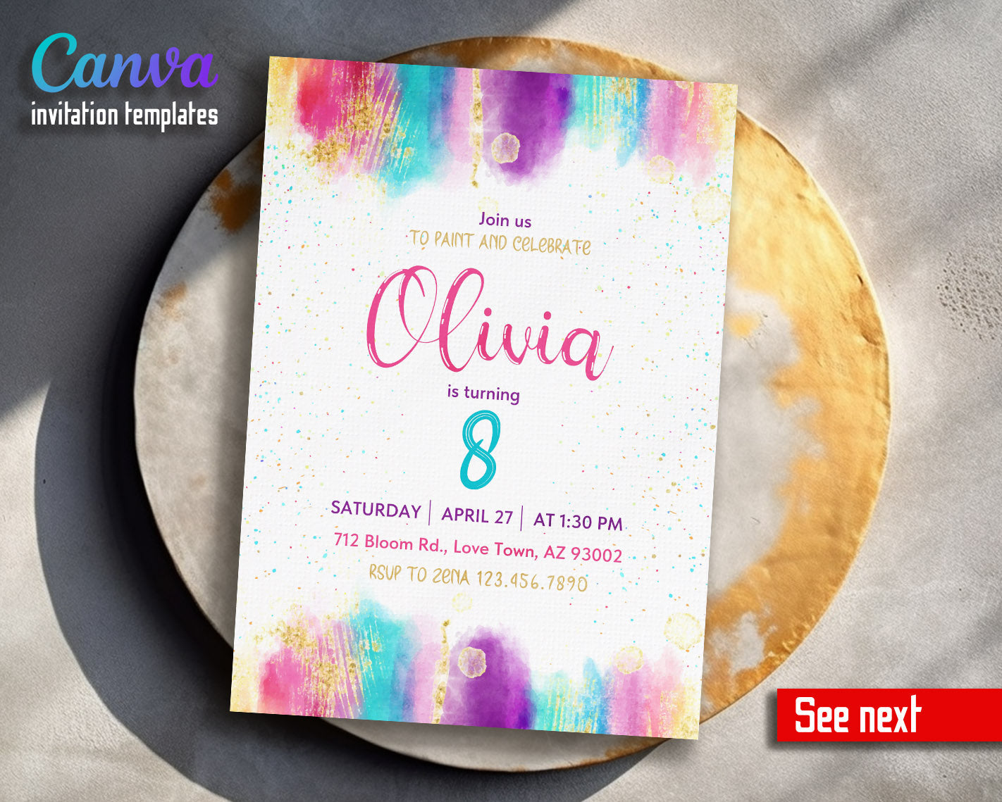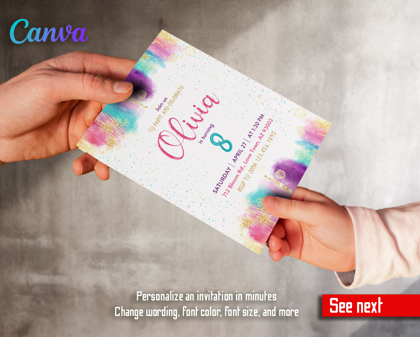 All the invitations are for self-editing. You will edit your template in Canva. It’s easy whether you're using the web browser or the app.