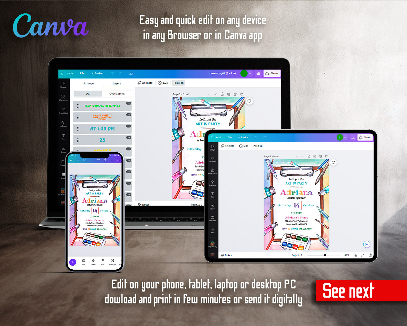 All the invitations are for self-editing. You will edit your template in Canva. It’s easy whether you're using the web browser or the app.