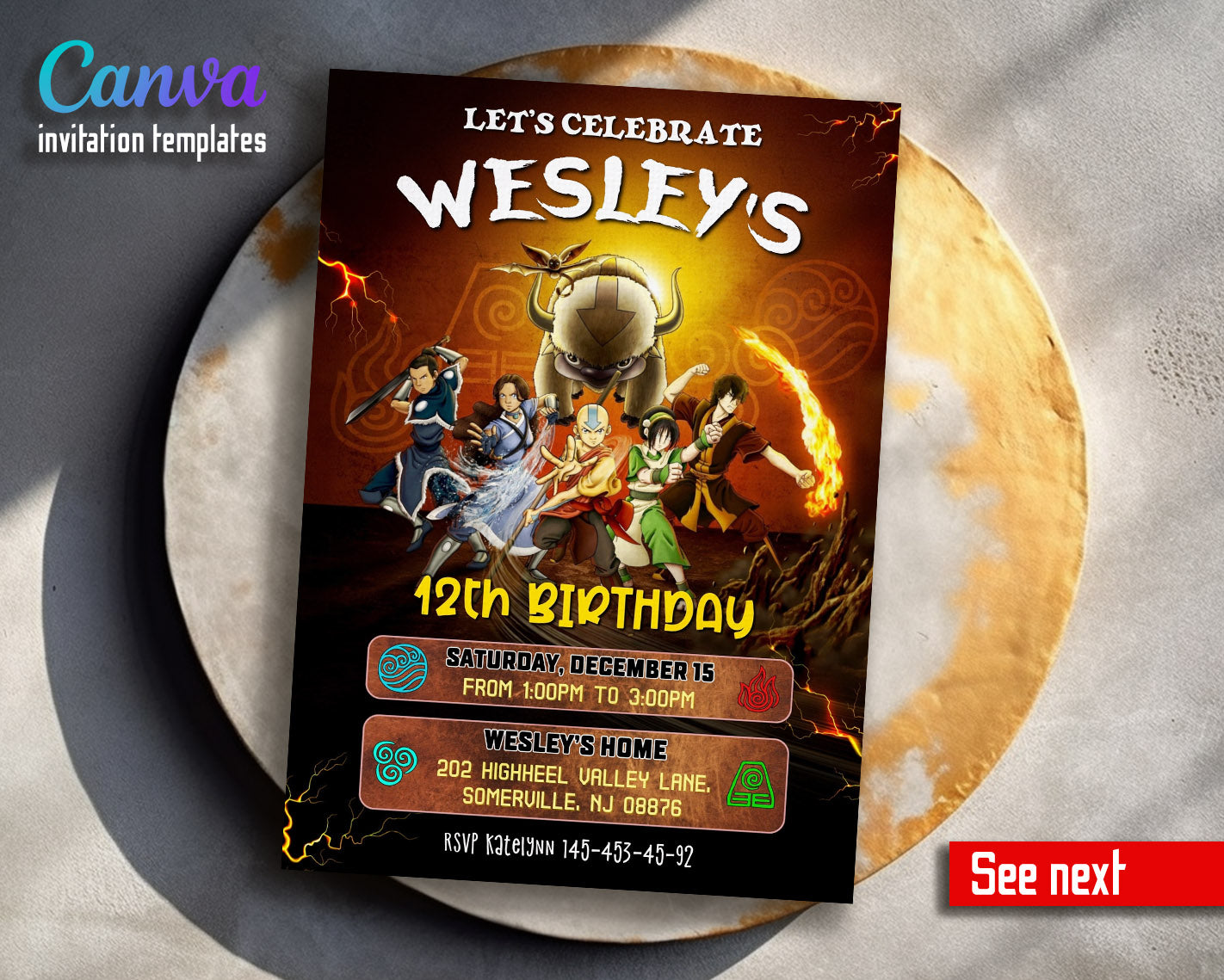 Related Tags: Avatar Airbender, Airbender invite, avatar invitation, anime party, boy girl birthday, Last Airbender bday, aang party, appa invitation, 1st 2nd 3rd bday, editable invitation, birthday invitation, printable invitation, invite template