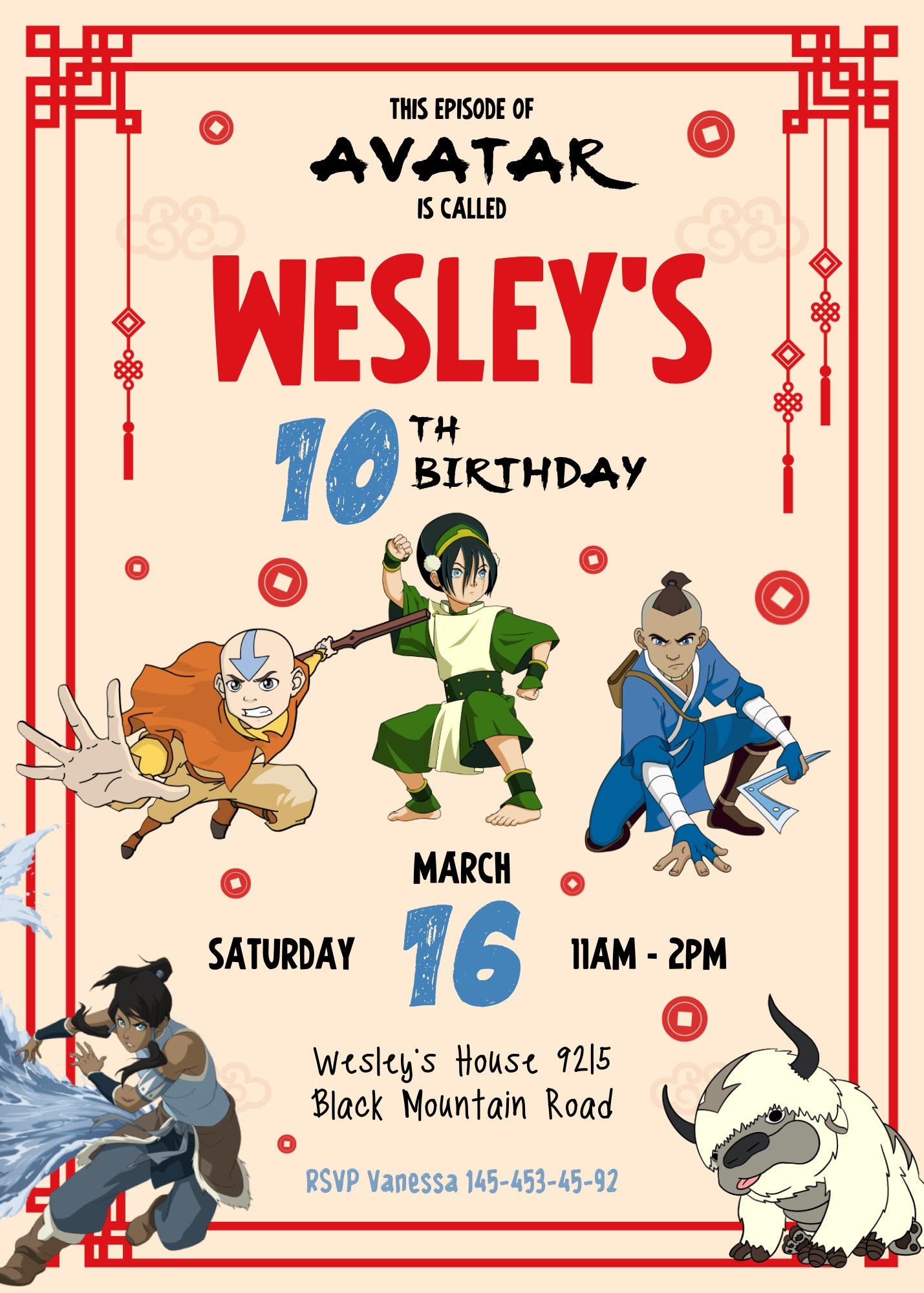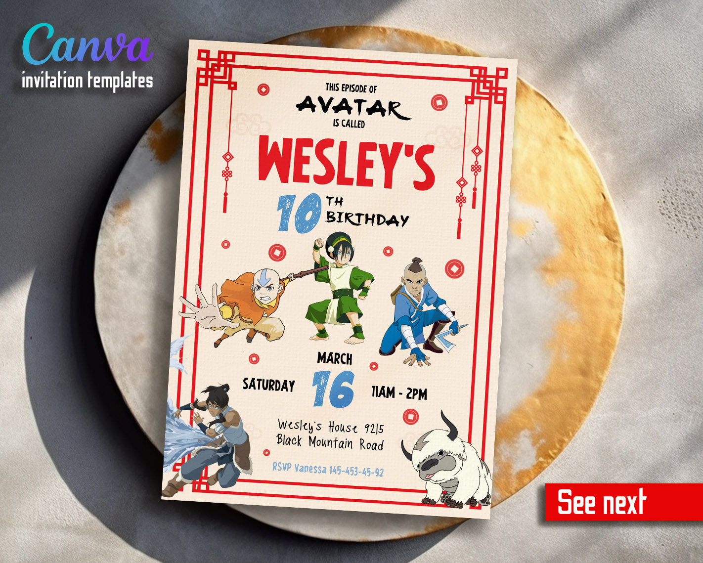 Related Tags: Avatar Airbender, Airbender invite, avatar invitation, anime party, boy girl birthday, Last Airbender bday, aang party, appa invitation, 1st 2nd 3rd bday, editable invitation, birthday invitation, printable invitation, invite template