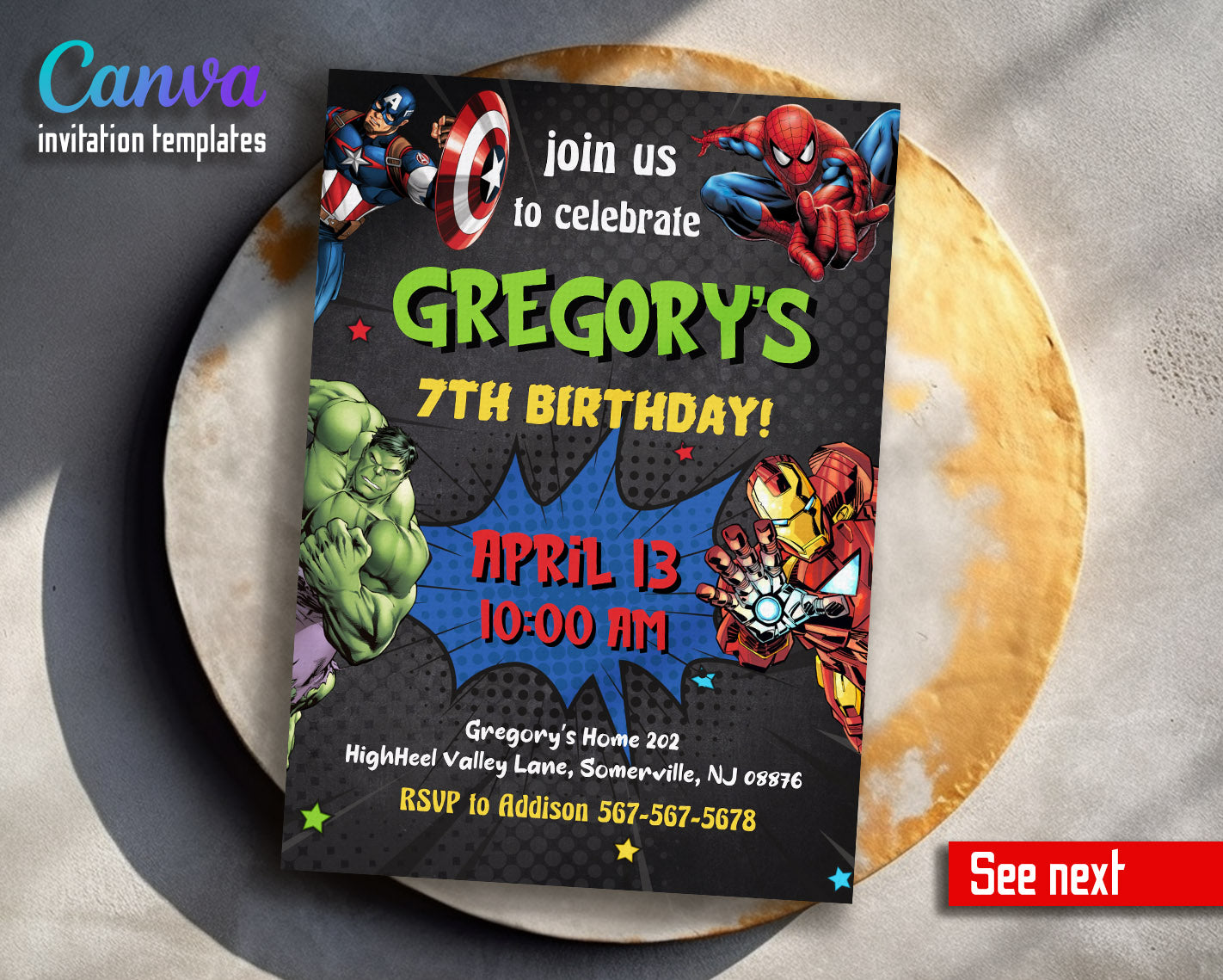Printable Editable customizable Avengers Marvel Superhero birthday party invitation digital template. Instant download invite.