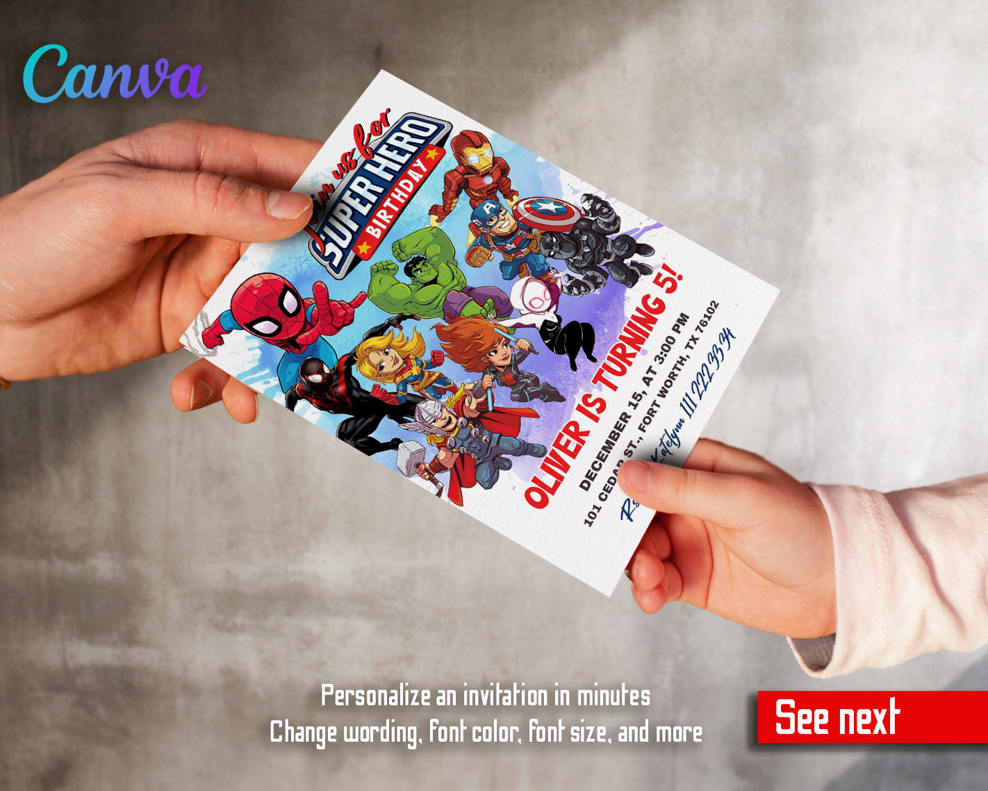 Printable Editable customizable Avengers Marvel Superhero birthday party invitation digital template. Instant download invite.