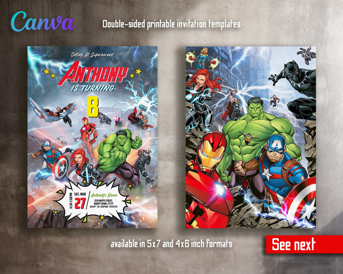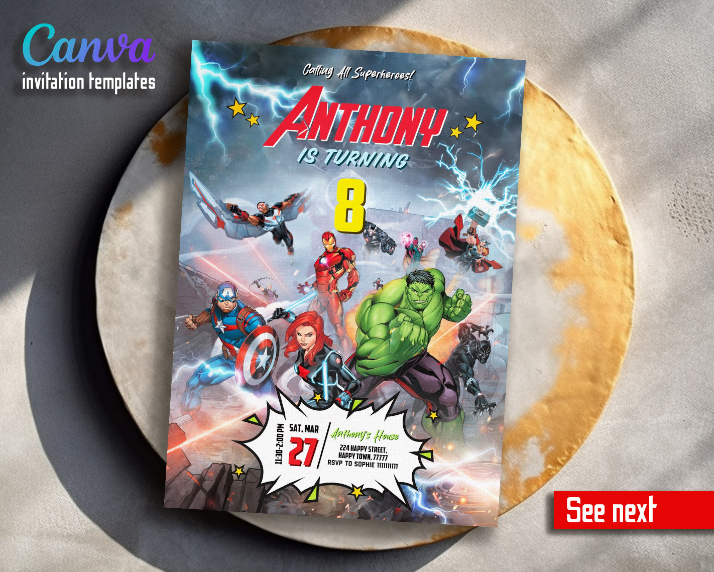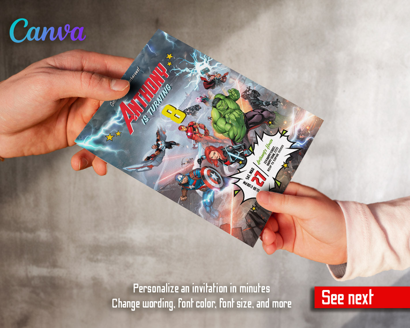 Printable Editable customizable Avengers Marvel Superhero birthday party invitation digital template. Instant download invite.