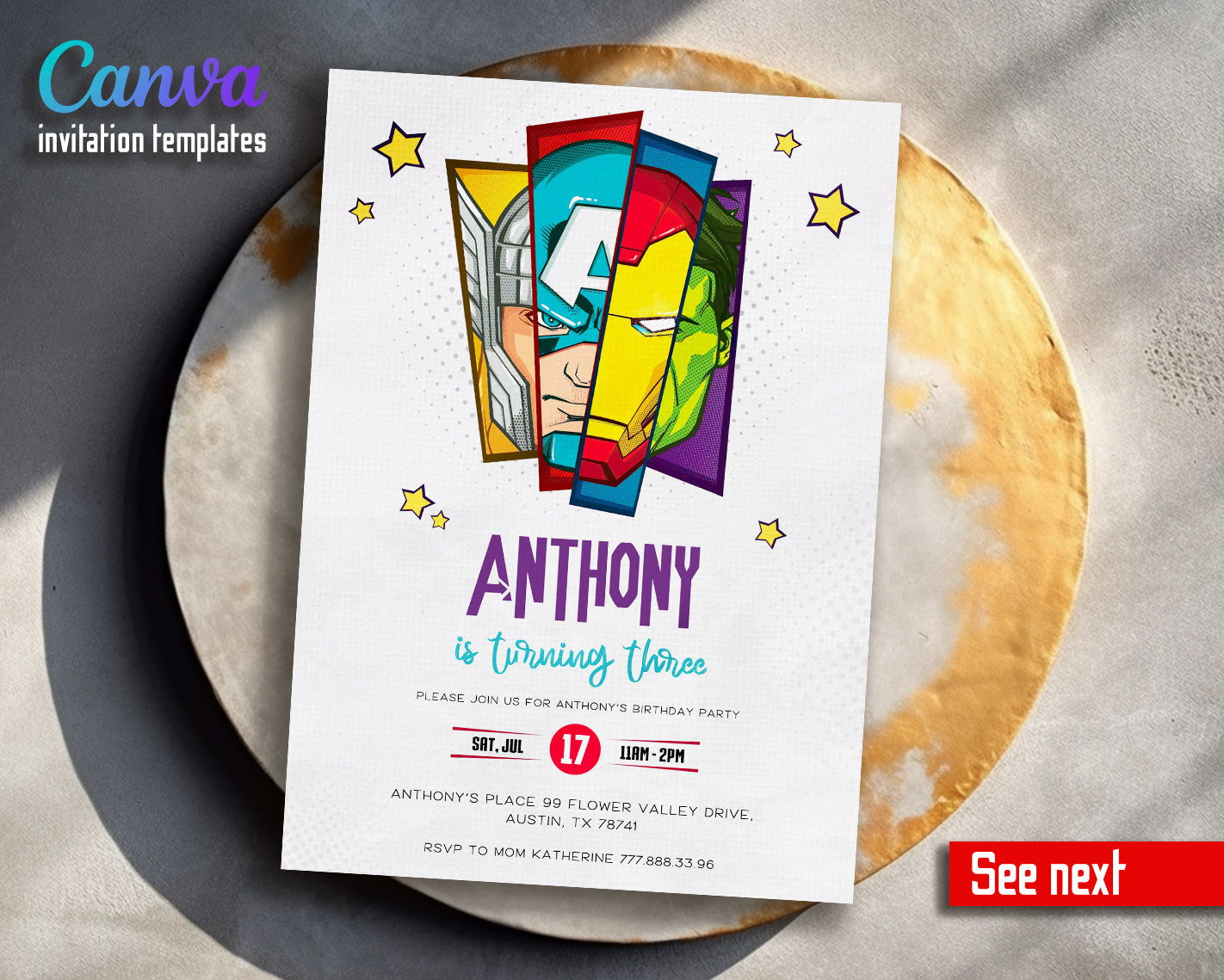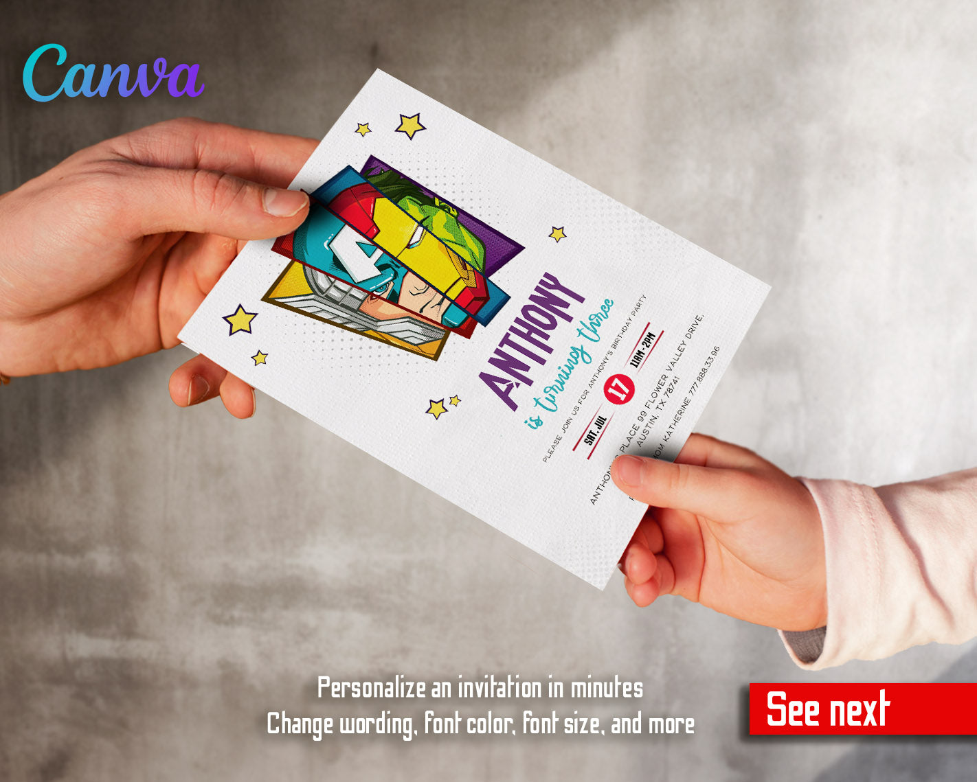 Printable Editable customizable Avengers Marvel Superhero birthday party invitation digital template. Instant download invite.