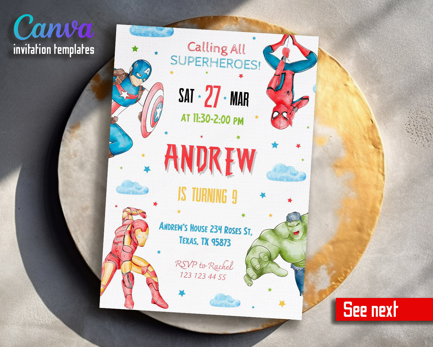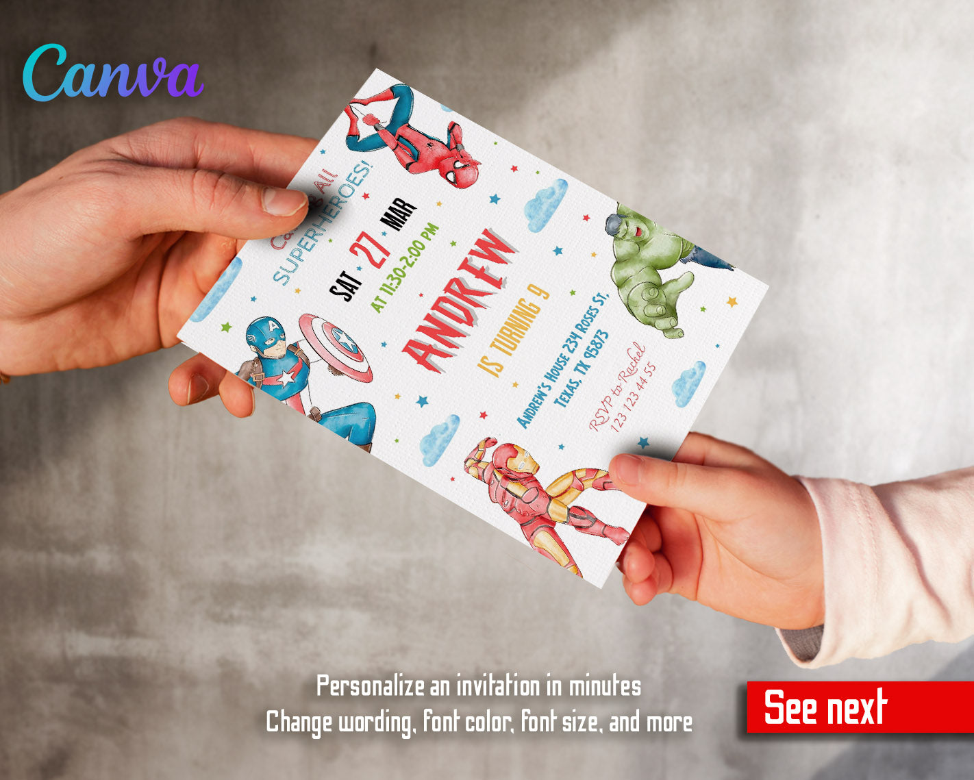 Printable Editable customizable Avengers Marvel Superhero birthday party invitation digital template. Instant download invite.