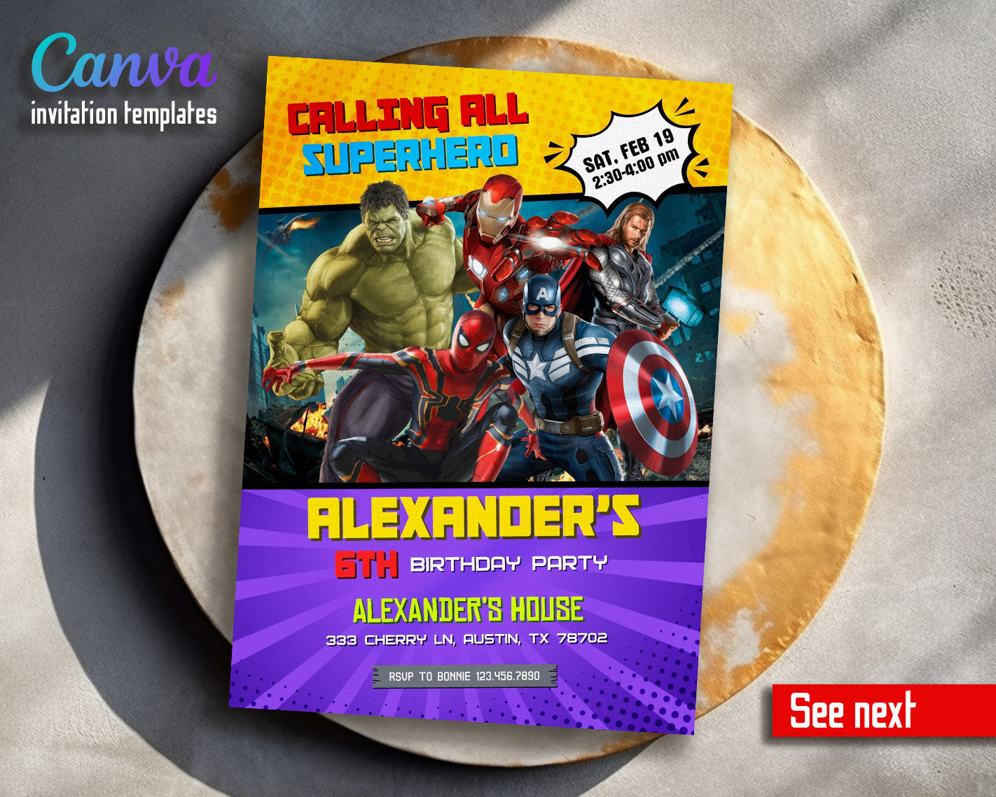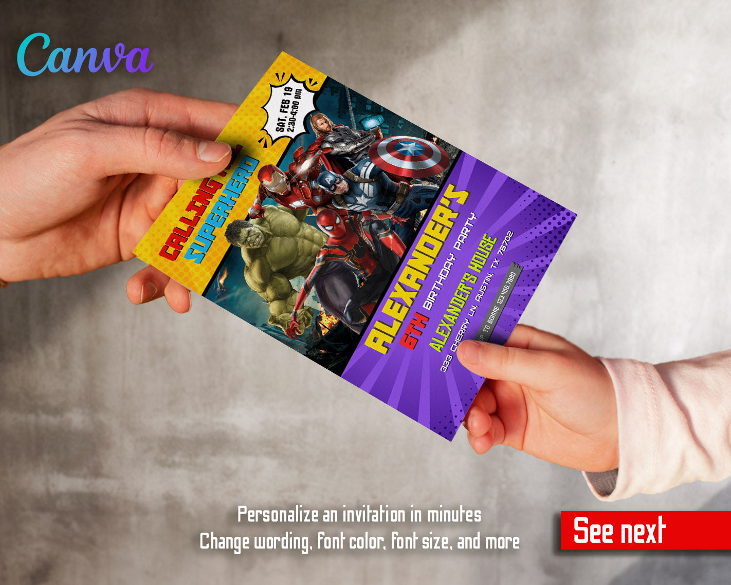 Printable Editable customizable Avengers Marvel Superhero birthday party invitation digital template. Instant download invite.