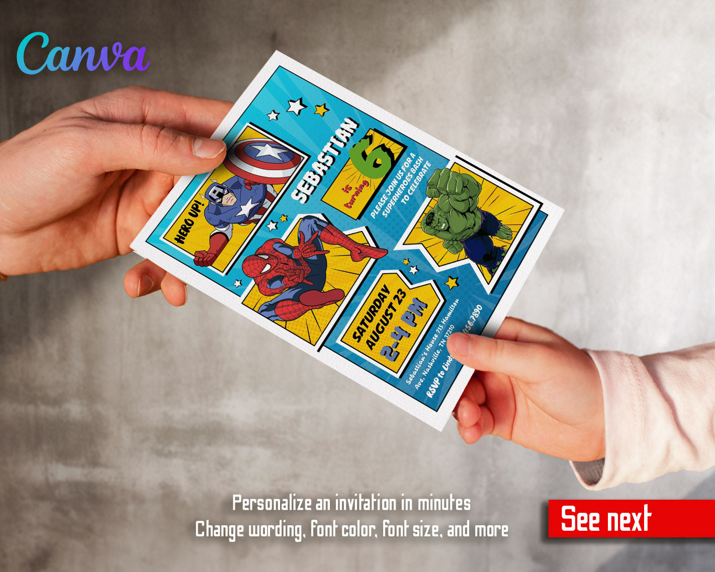 Printable Editable customizable Avengers Marvel Superhero birthday party invitation digital template. Instant download invite.