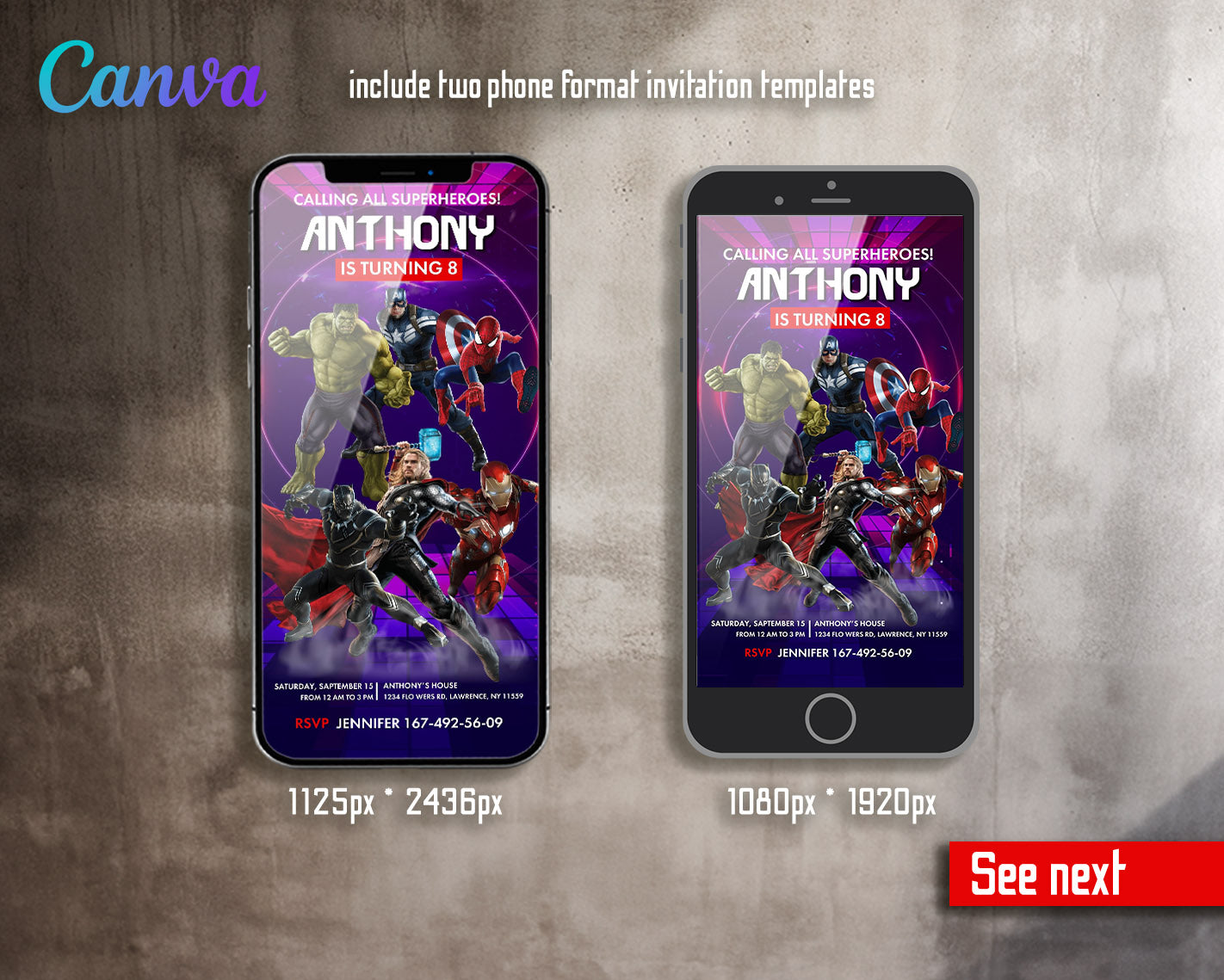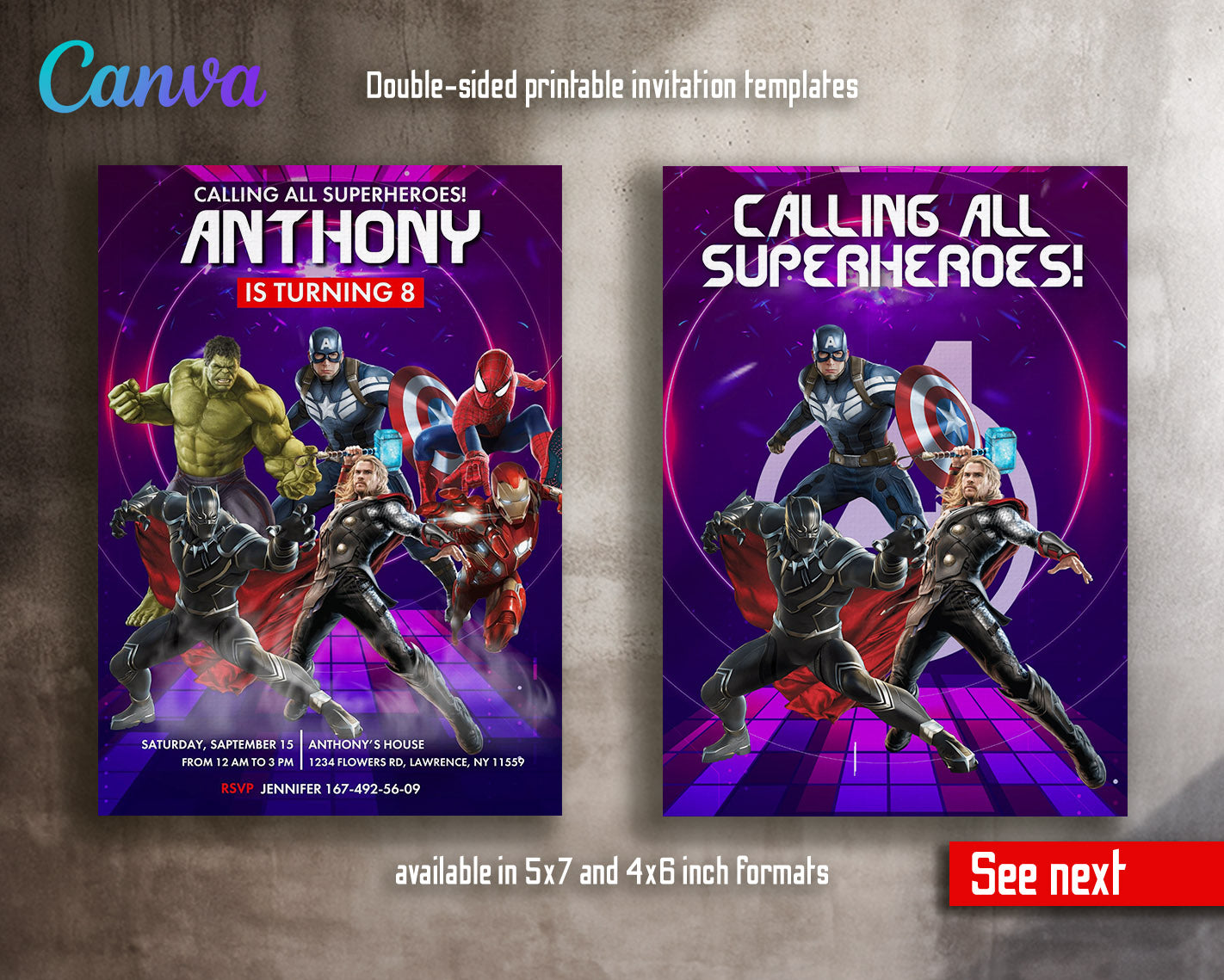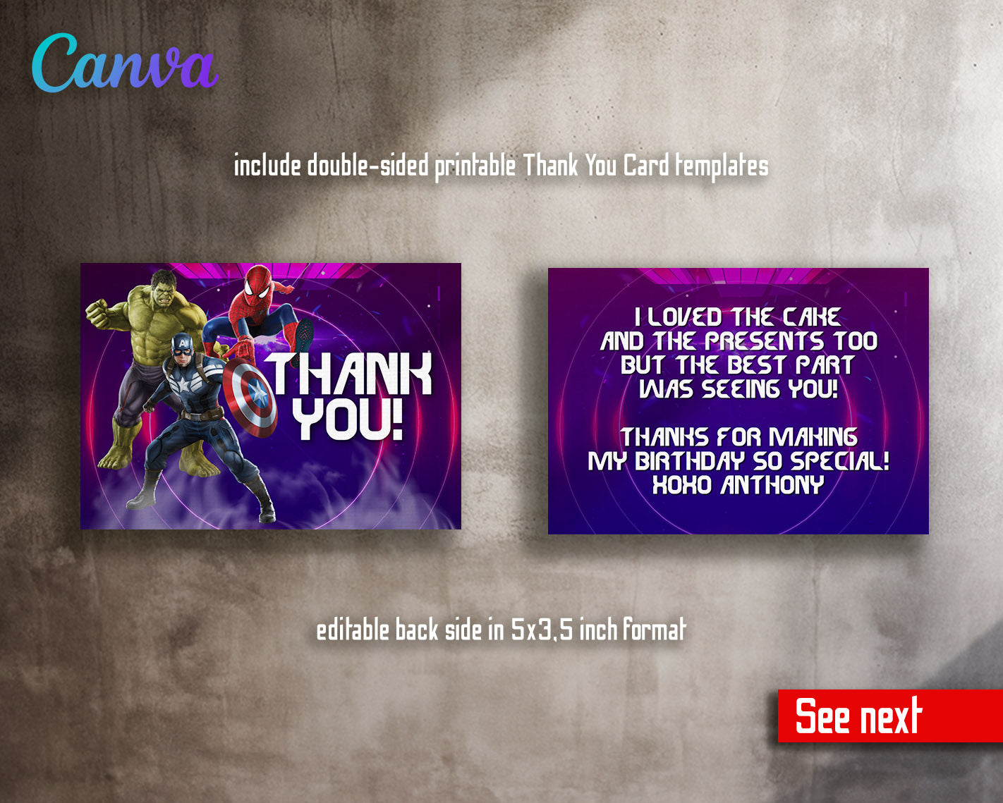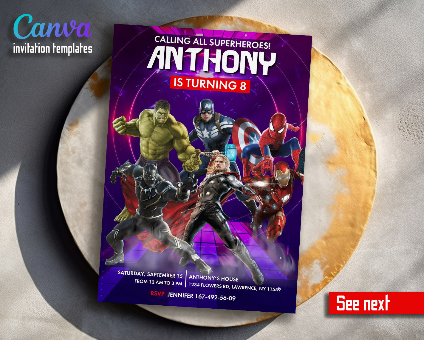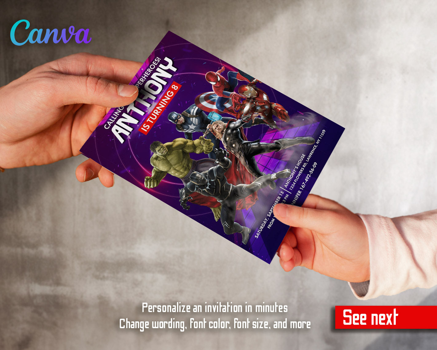 Printable Editable customizable Avengers Marvel Superhero birthday party invitation digital template. Instant download invite.