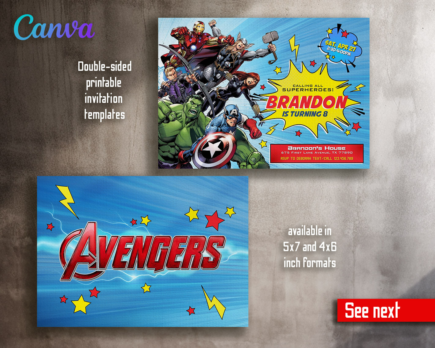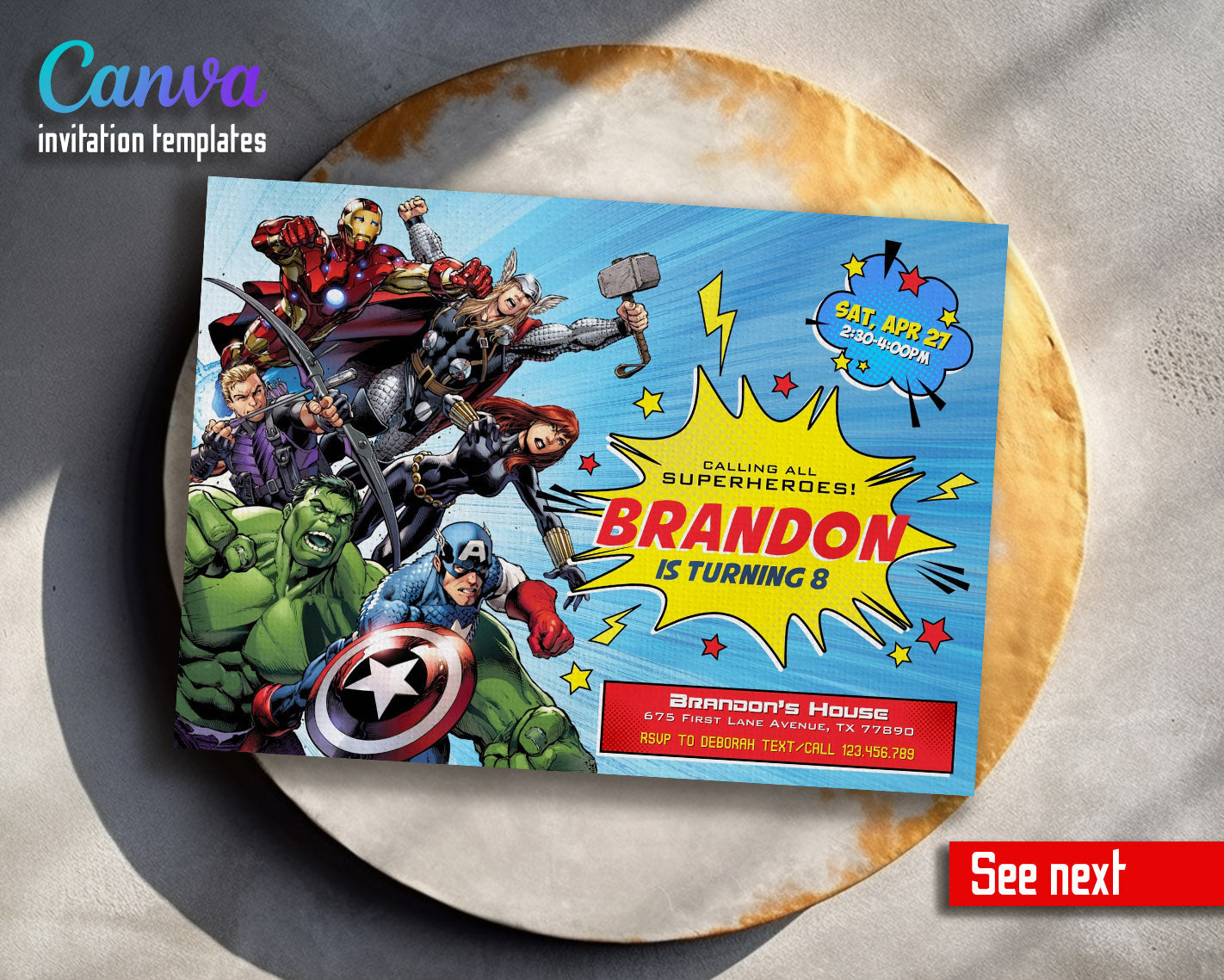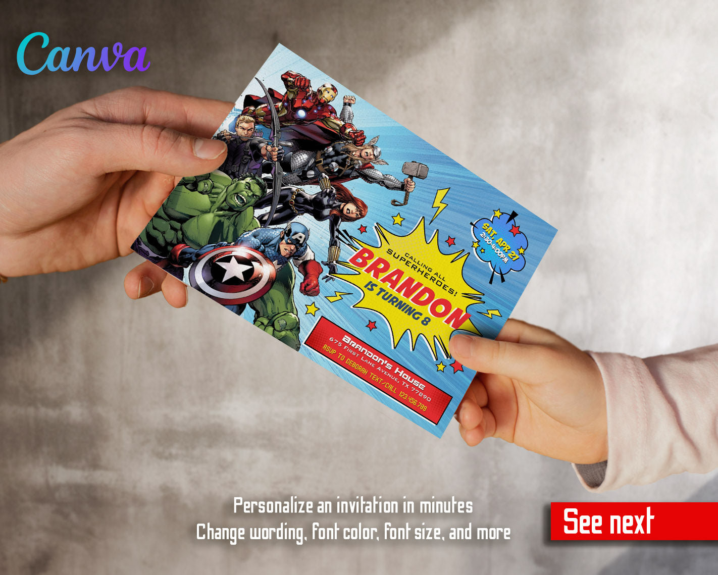 Printable Editable customizable Avengers Marvel Superhero birthday party invitation digital template. Instant download invite.