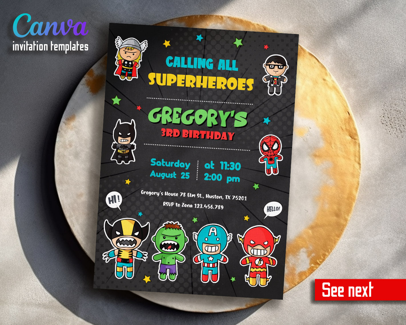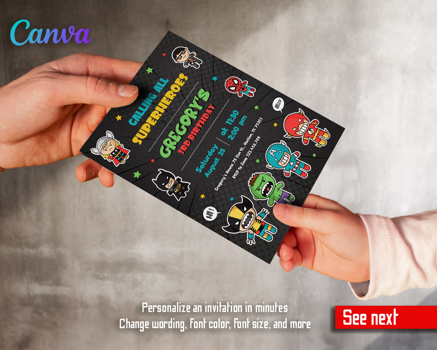 Printable Editable customizable Avengers Marvel Superhero birthday party invitation digital template. Instant download invite.