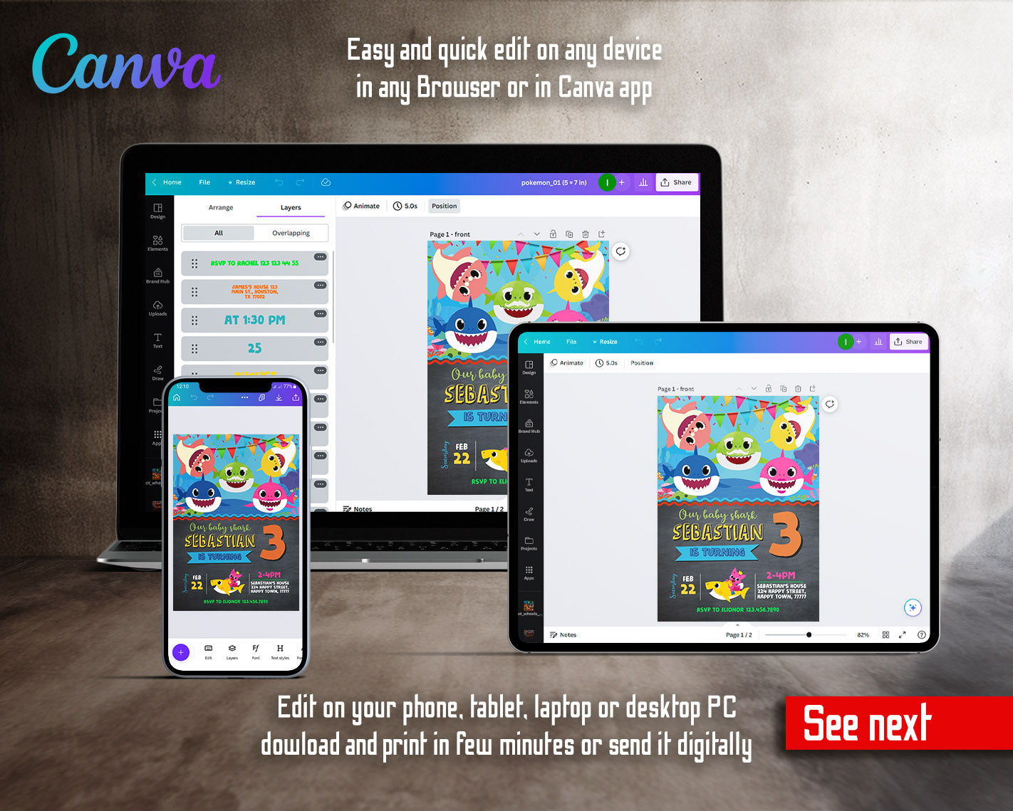 All the invitations are for self-editing. You will edit your template in Canva. It’s easy whether you're using the web browser or the app.