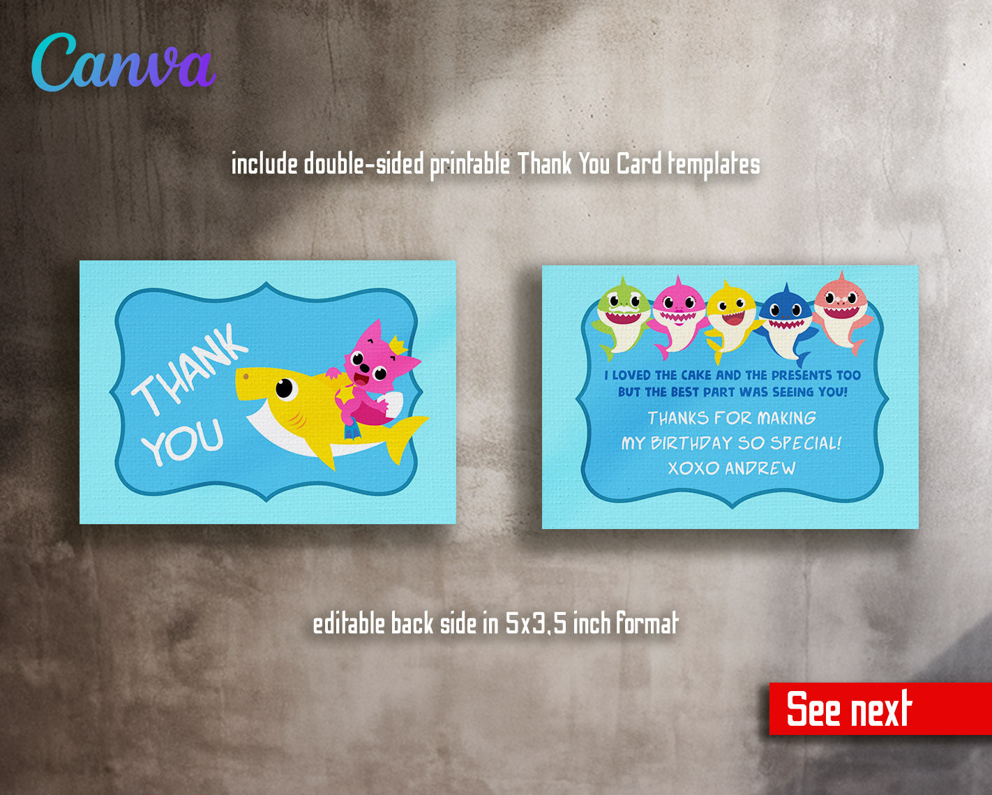 Printable Editable customizable Baby Shark birthday party invitation digital template. Instant download invite.