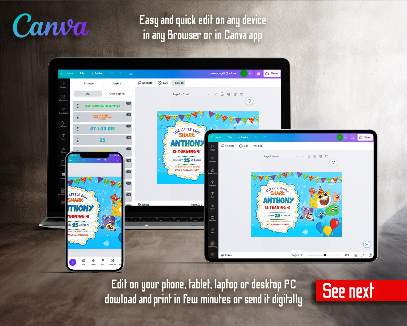 All the invitations are for self-editing. You will edit your template in Canva. It’s easy whether you're using the web browser or the app.