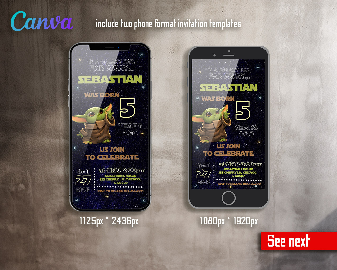 All the invitations are for self-editing. You will edit your template in Canva. It’s easy whether you're using the web browser or the app.