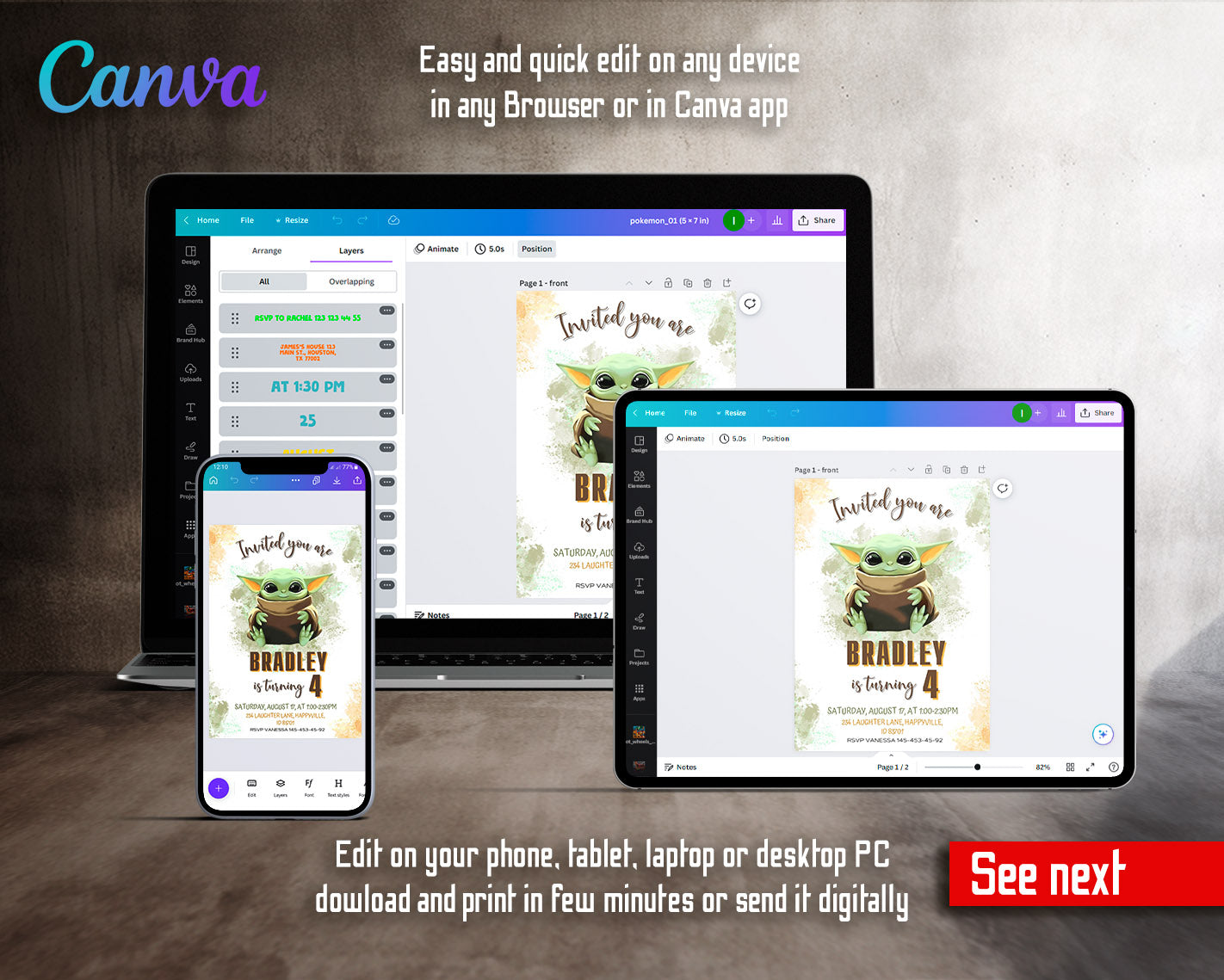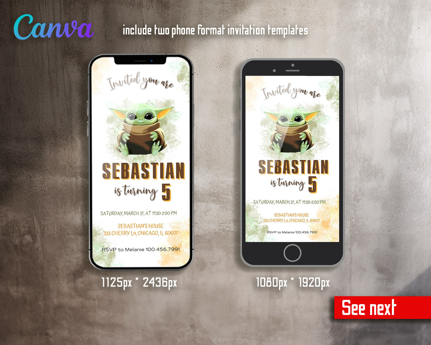Related Tags: baby yoda invitation, baby yoda birthday, mandalorian invite, grogu invitation, star wars party, digital invite, editable invitation, birthday invitation, printable invitation, invite template, evite, girl birthday,