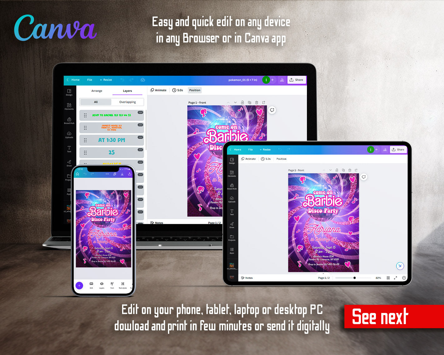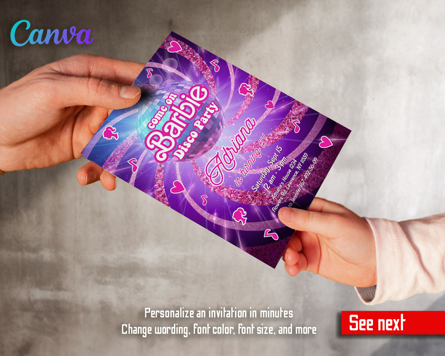 Printable Editable customizable Barbie Pink birthday party invitation digital template. Instant download invite.