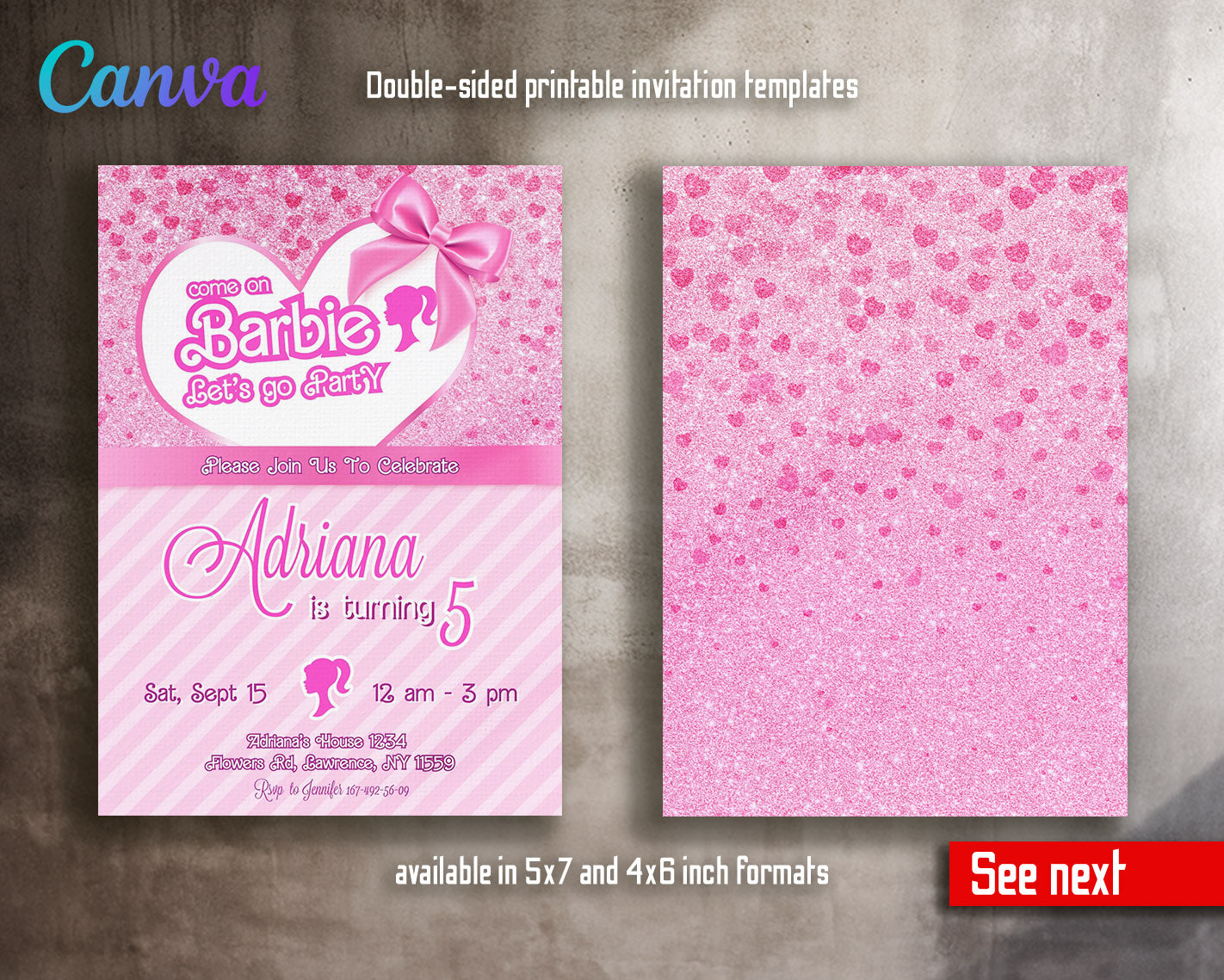 Printable Editable customizable Barbie Pink birthday party invitation digital template. Instant download invite.