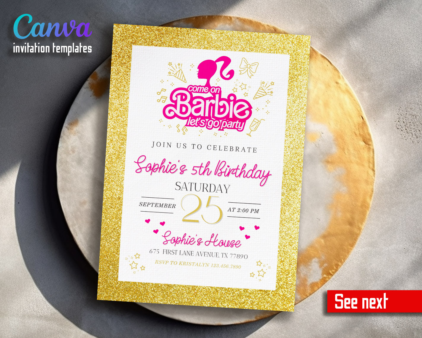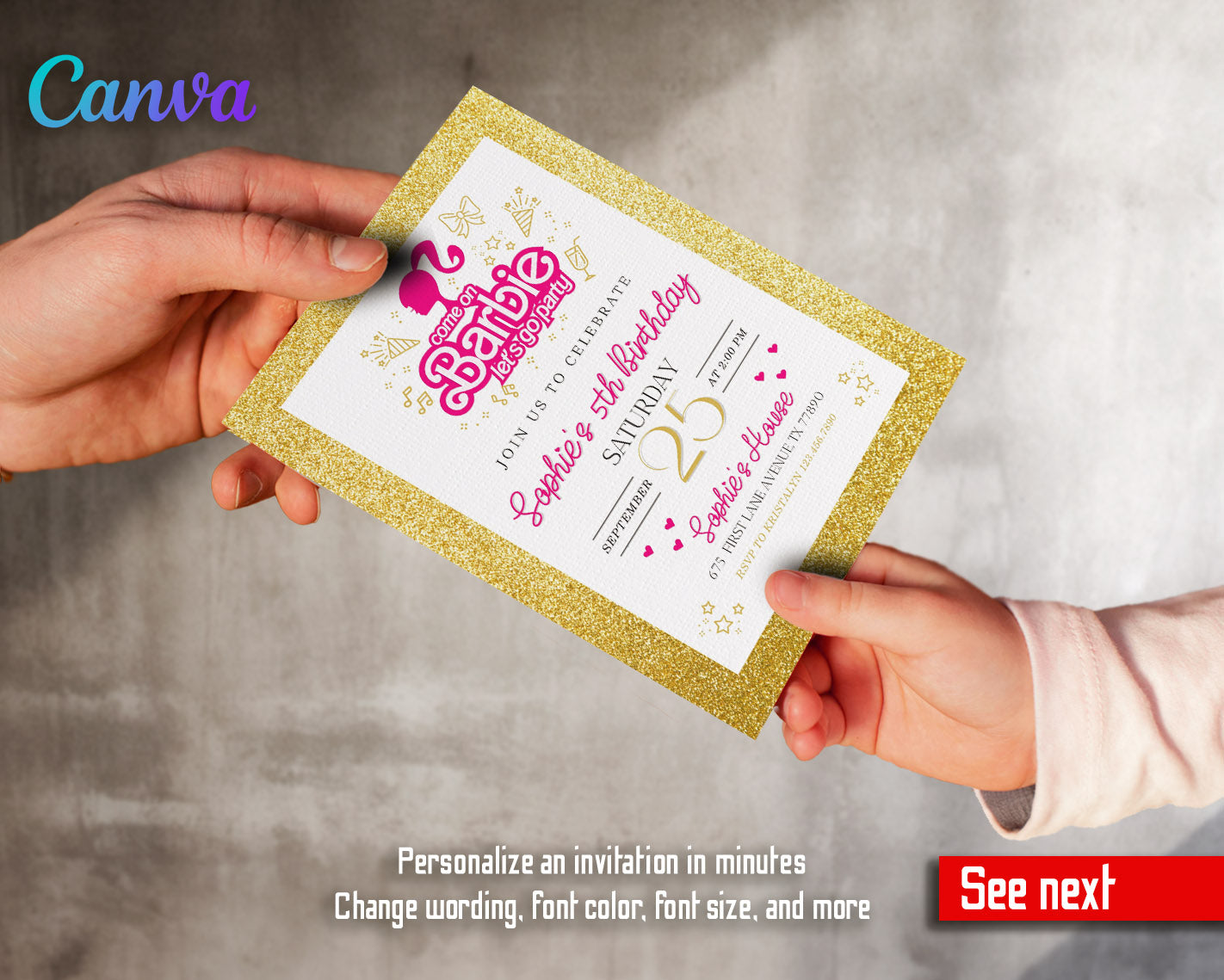 Printable Editable customizable Barbie Pink birthday party invitation digital template. Instant download invite.