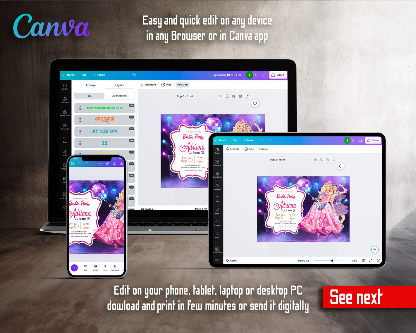 Printable Editable customizable Barbie Pink birthday party invitation digital template. Instant download invite.