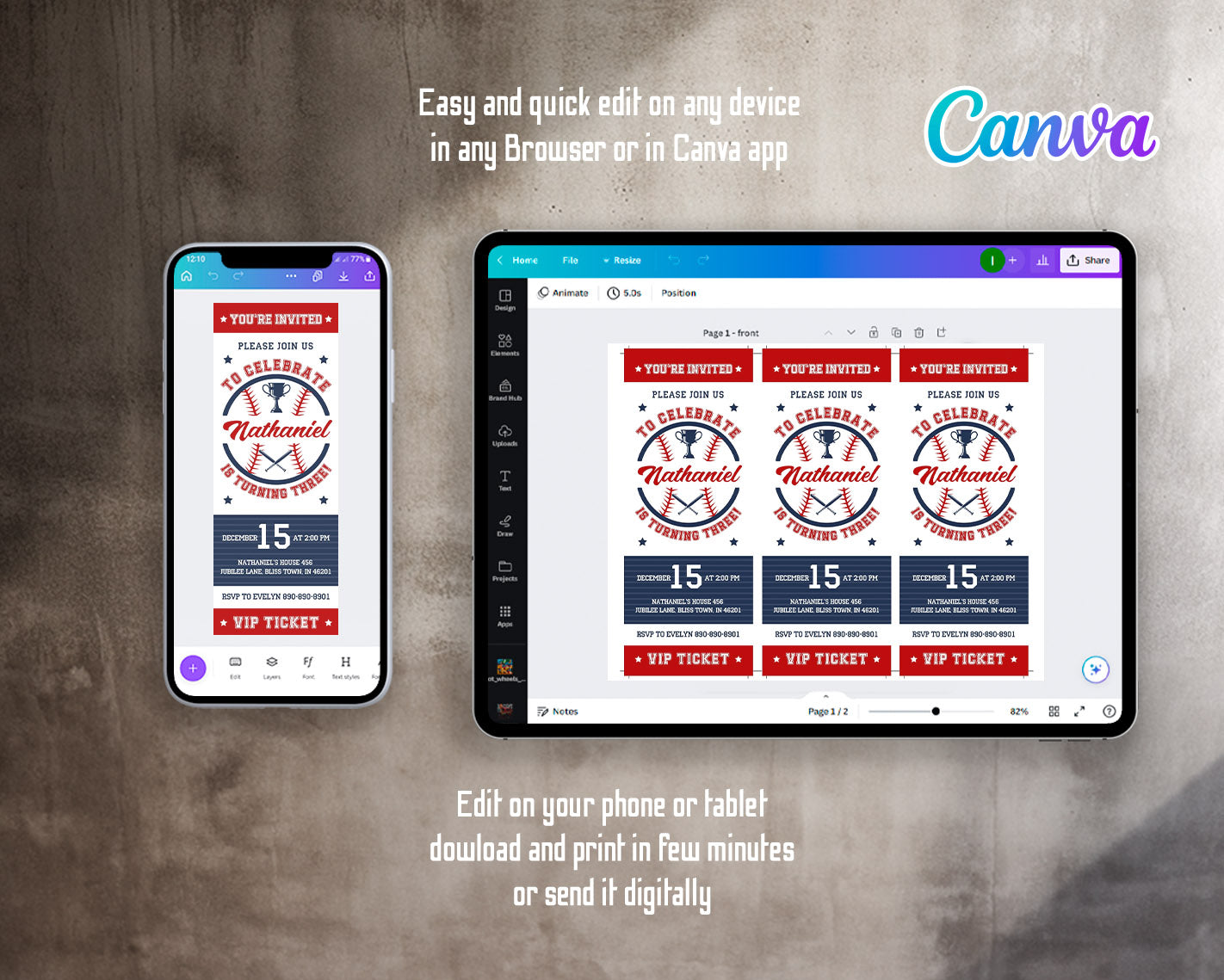 All the invitations are for self-editing. You will edit your template in Canva. It’s easy whether you're using the web browser or the app.
