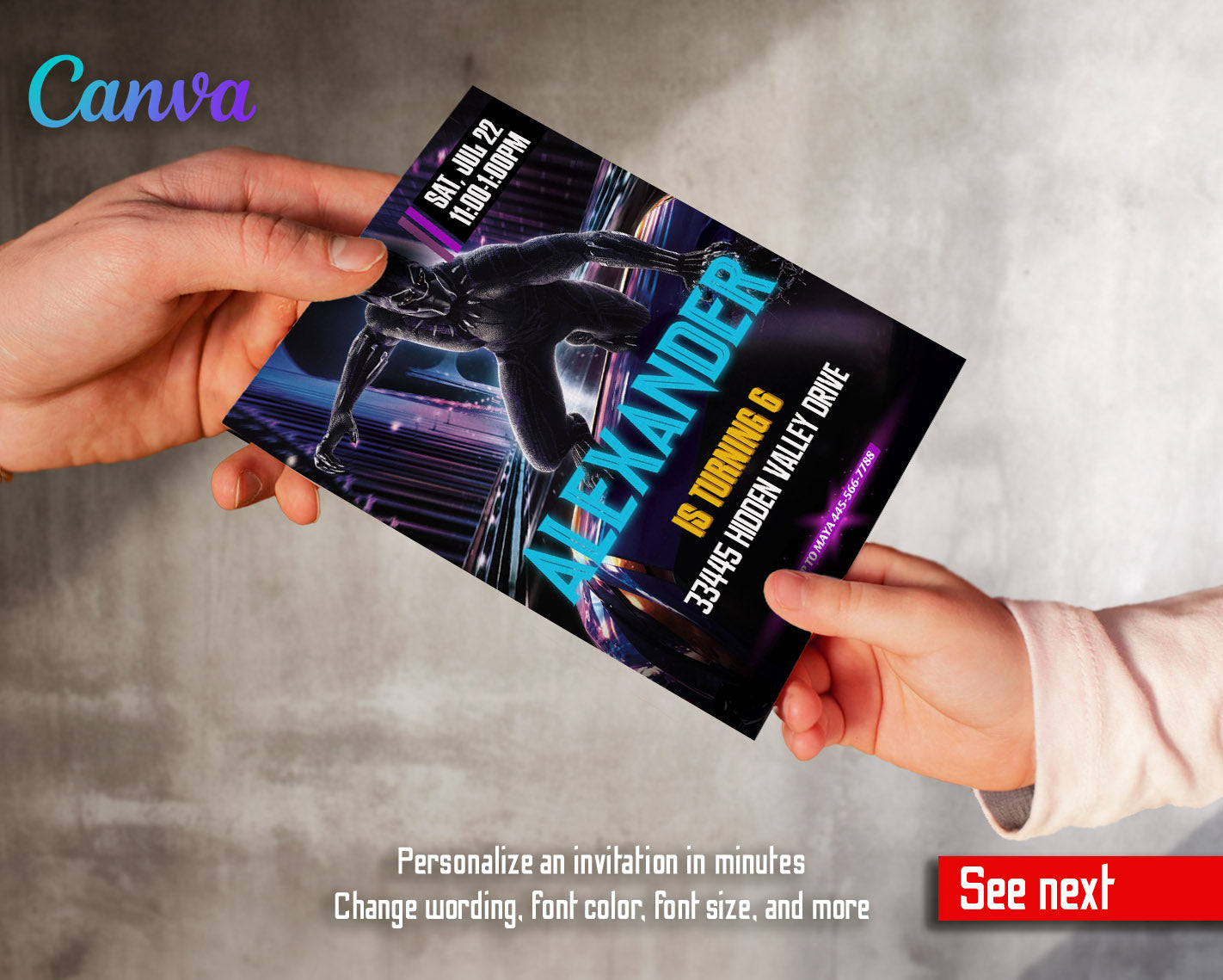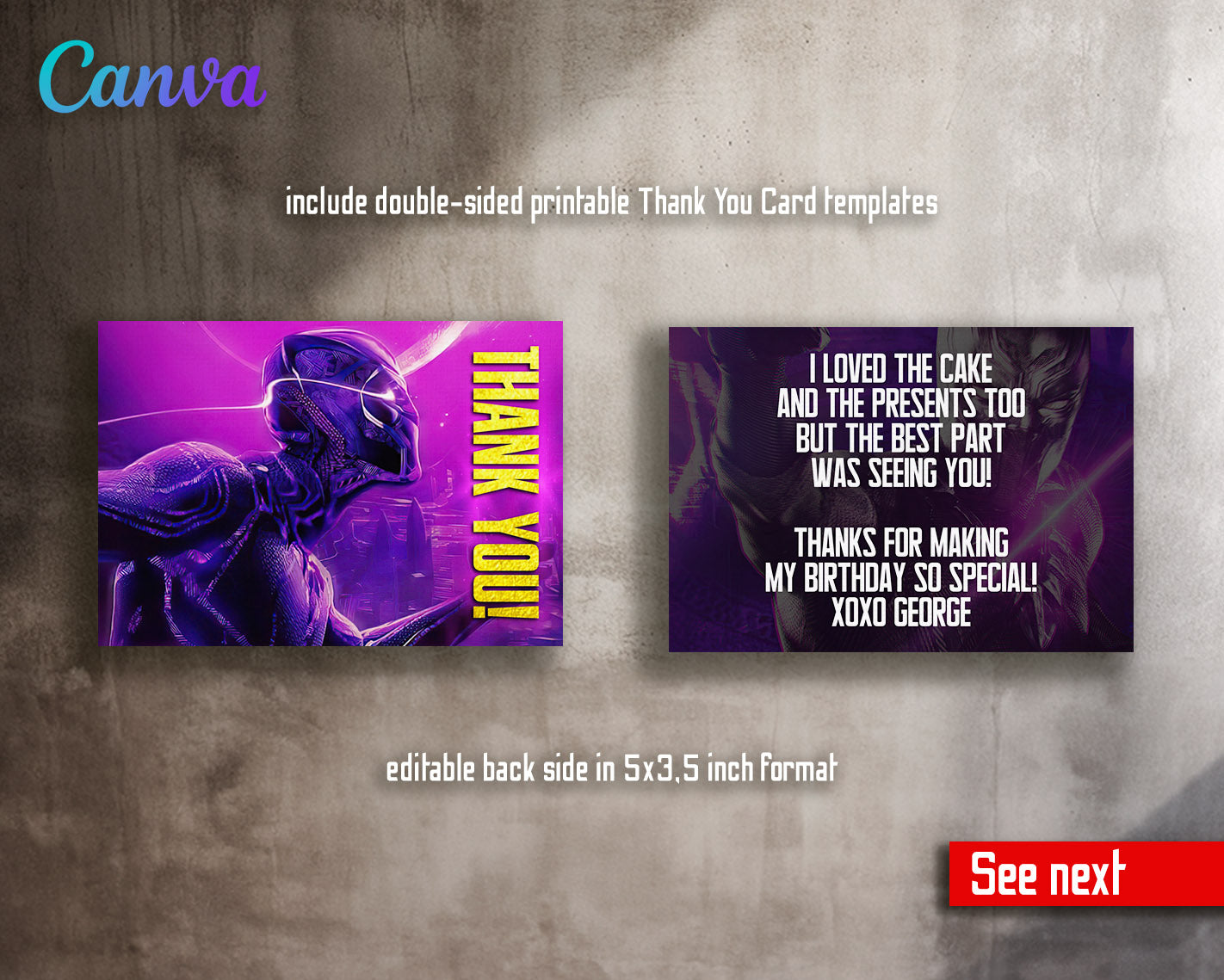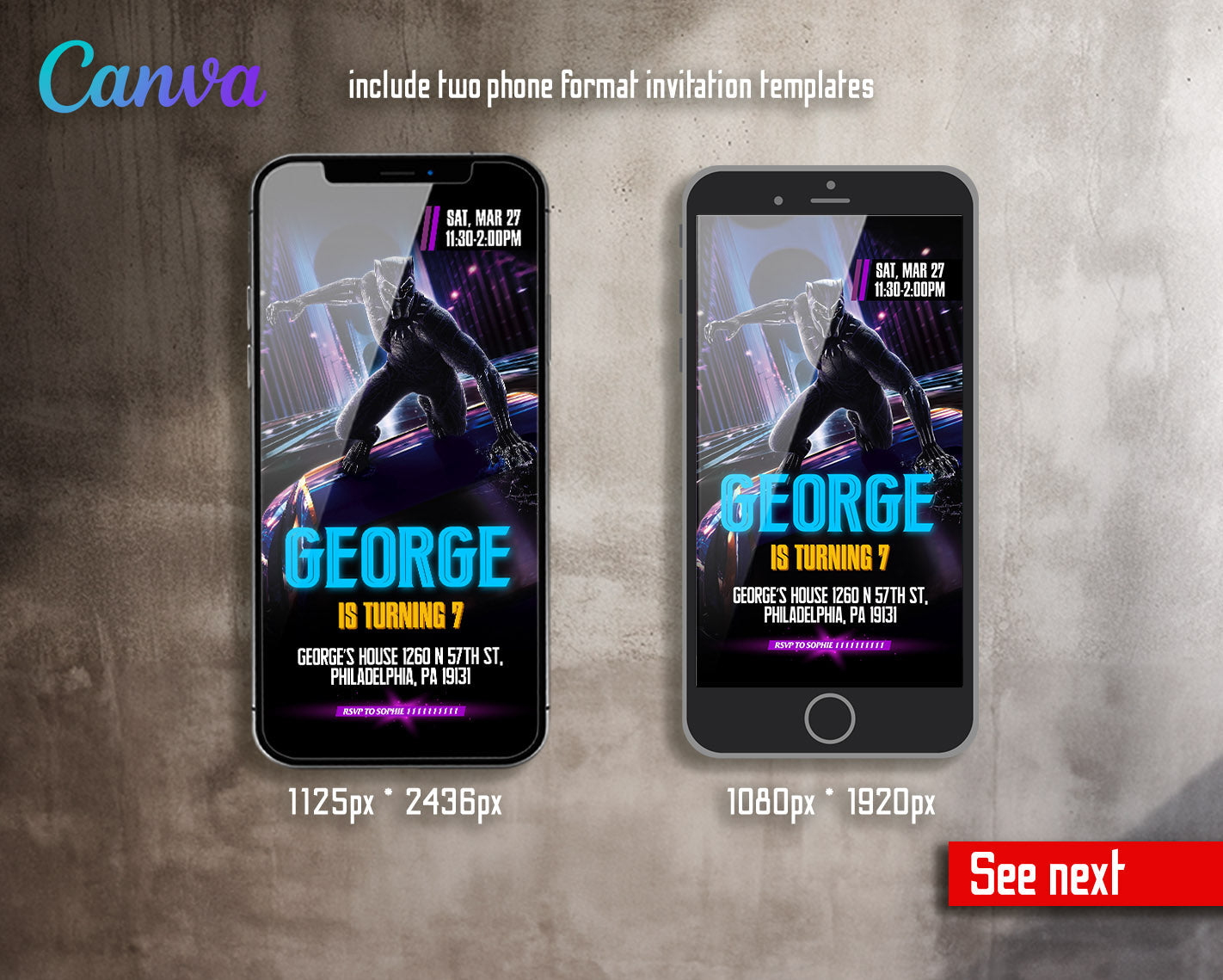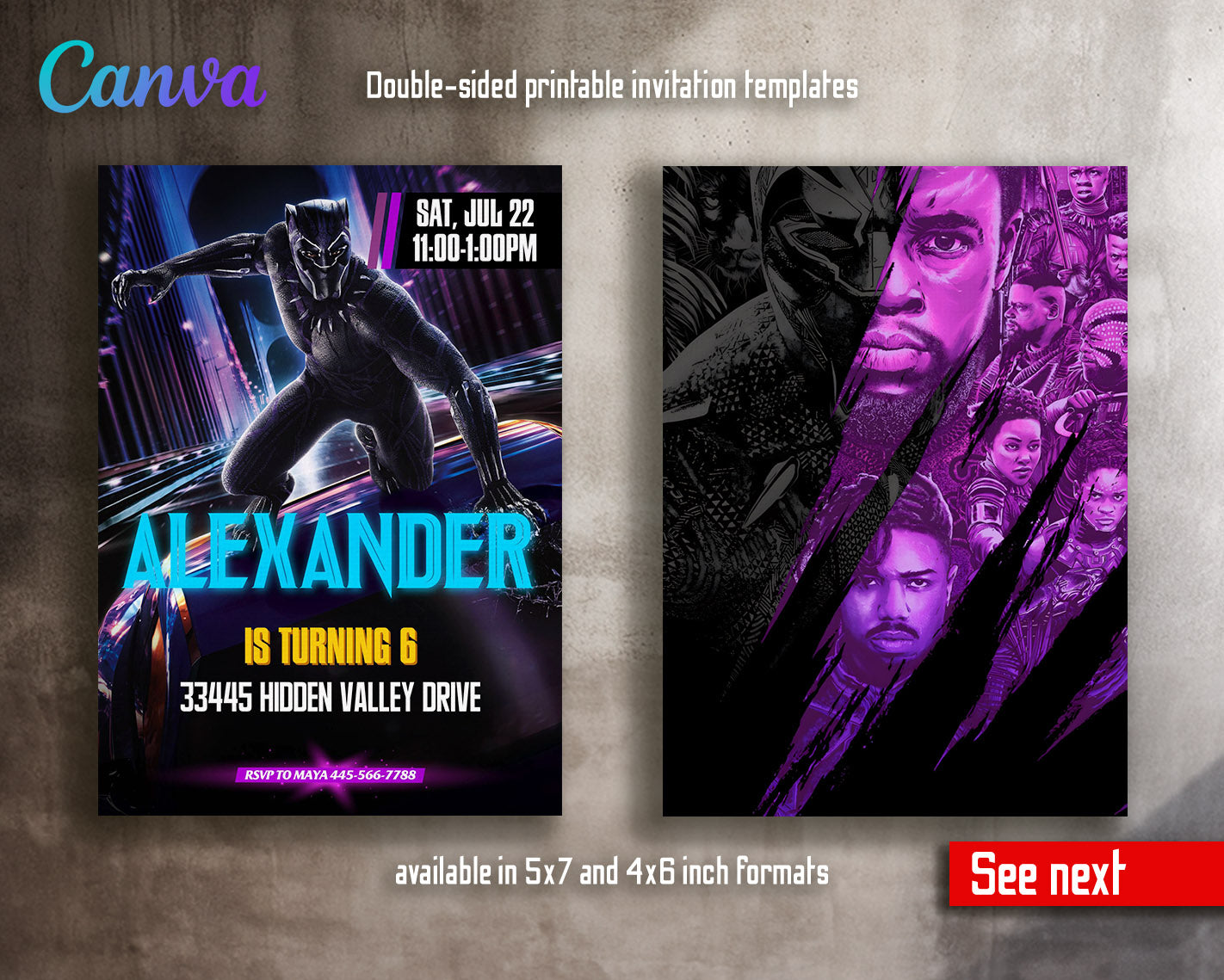 Printable Editable customizable Black Panther Superhero Marvel birthday party invitation digital template. Instant download invite.