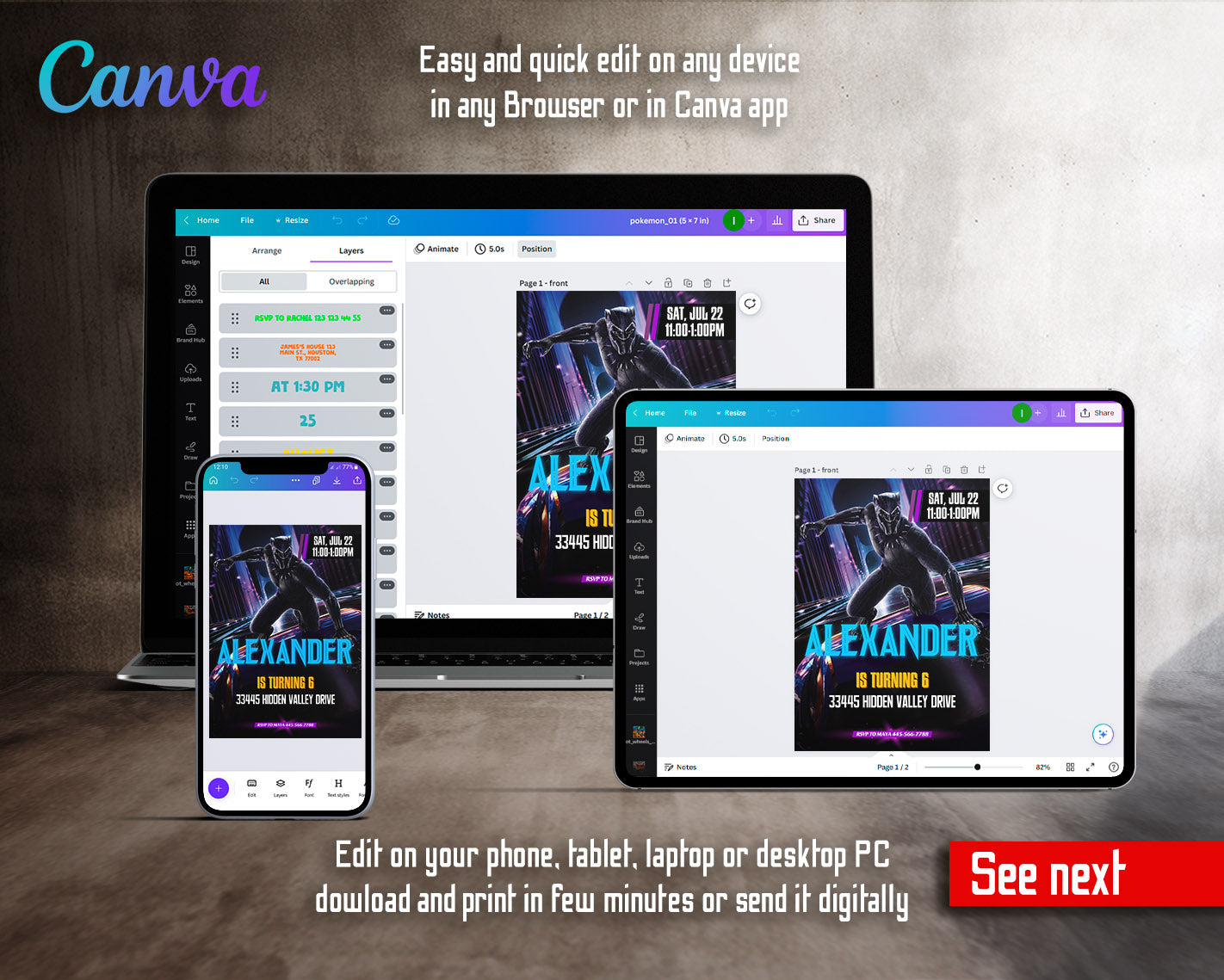 Related Tags: black panther invite, panther birthday, black invite, panther invitation, black panther party, wakanda forever, editable invitation, birthday invitation, printable invitation, invite template, marvel evite, superhero birthday,