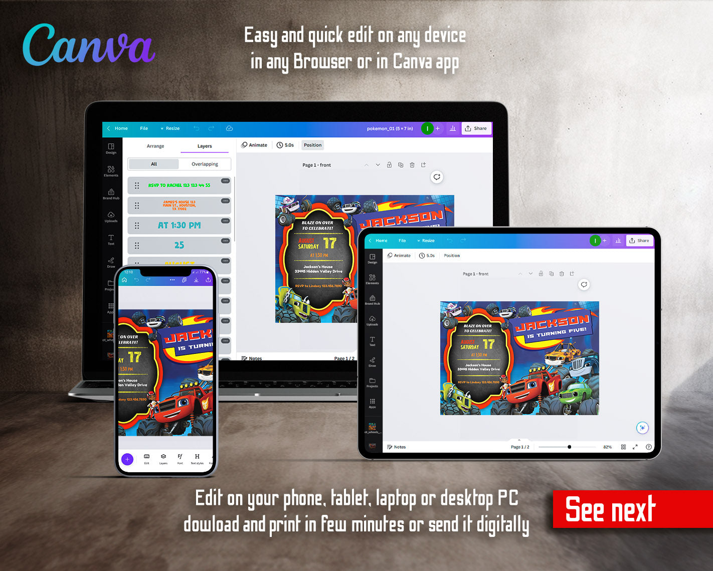 Related Tags: blaze birthday, blaze invite, blaze invitation, Monster machines, boy birthday, Monster truck invite, racing party, invitation for boy, 1st 2nd 3rd bday, editable invitation, birthday invitation, printable invitation, invite template