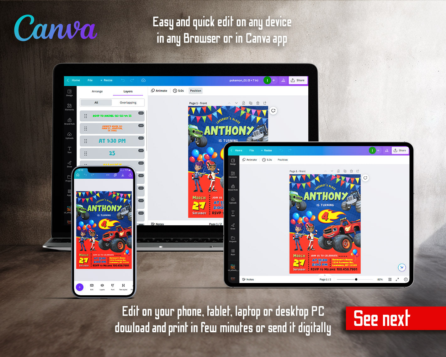Related Tags: blaze birthday, blaze invite, blaze invitation, Monster machines, boy birthday, Monster truck invite, racing party, invitation for boy, 1st 2nd 3rd bday, editable invitation, birthday invitation, printable invitation, invite template