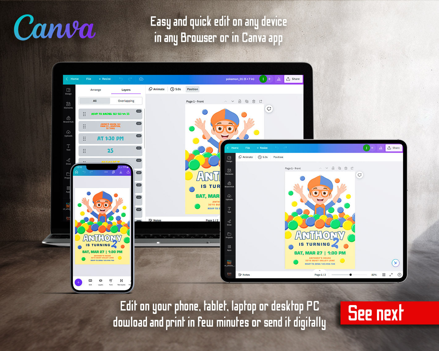Related Tags: blippi birthday, excavator invite, blippi invitation, blue orange party, boy girl birthday, construction invite, blippi party, invitation, 1st 2nd 3rd bday, editable invitation, birthday invitation, printable invitation, invite template
