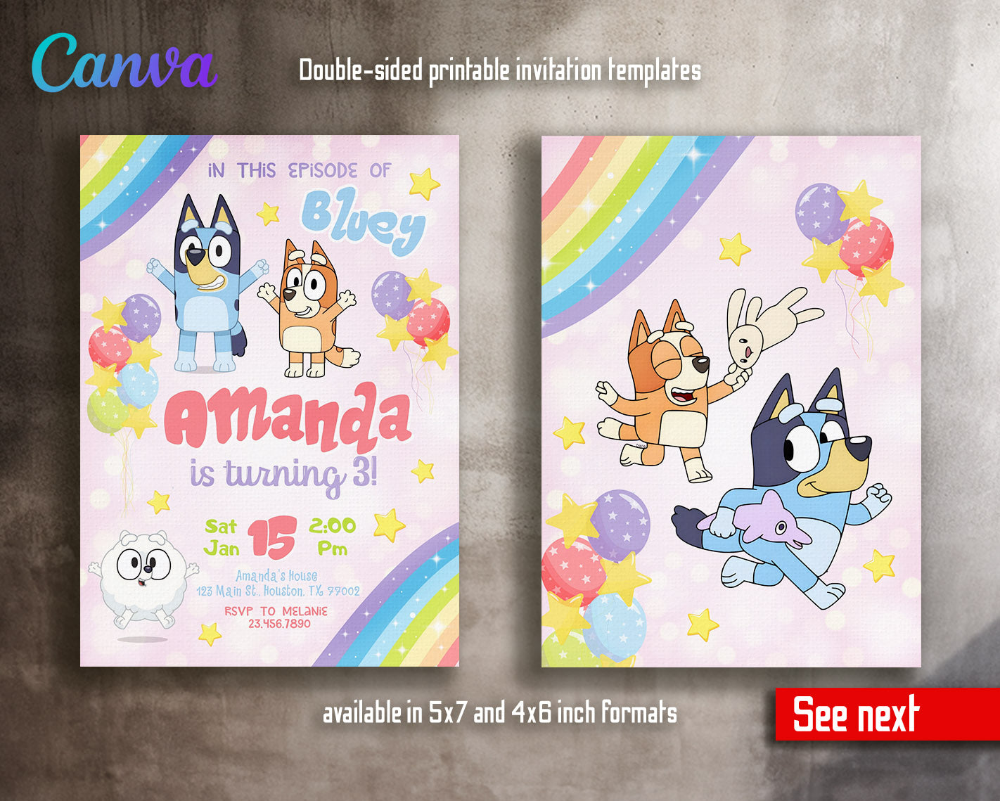 Printable Editable customizable Bluey Bingo birthday party invitation digital template. Instant download invite.