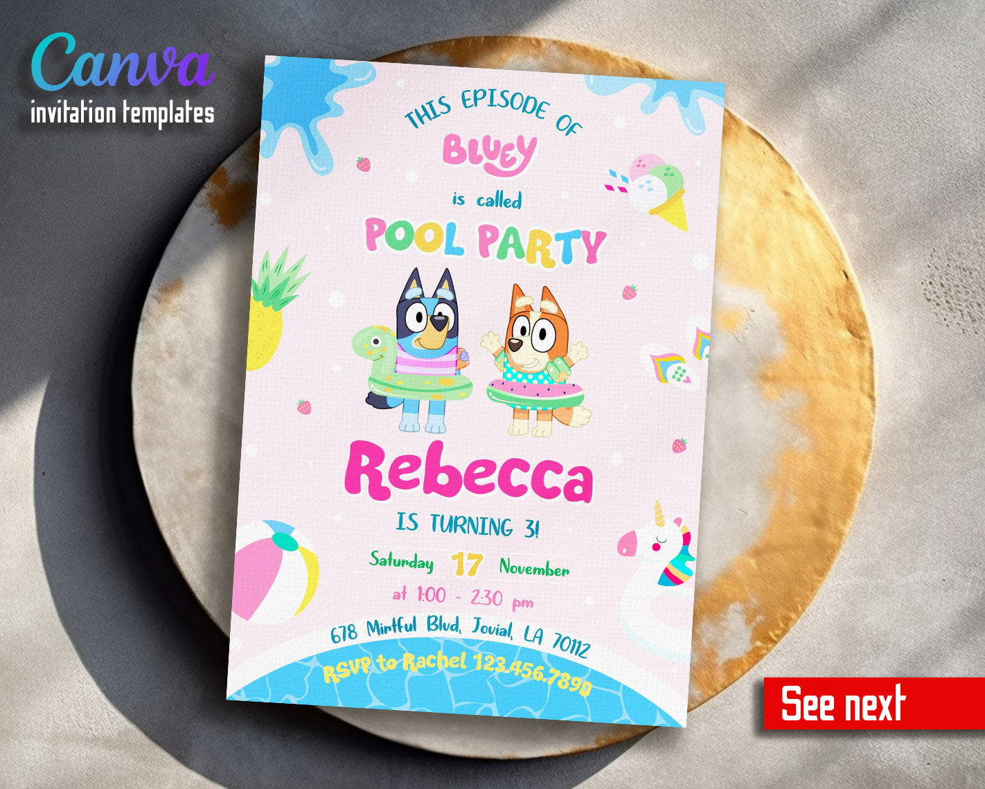 Related Tags: bluey invitation, bluey and bingo, bluey invite, puppy birthday, summer party, Blue Heeler puppy, editable invitation, swimming birthday, printable invitation, pool party, girl evite, bingo invite, boy birthday