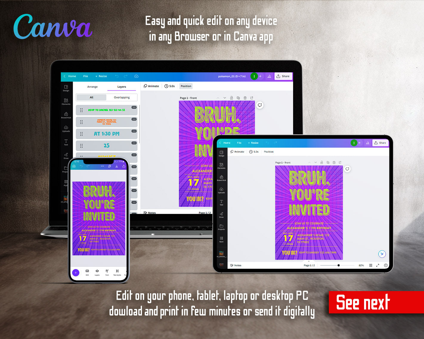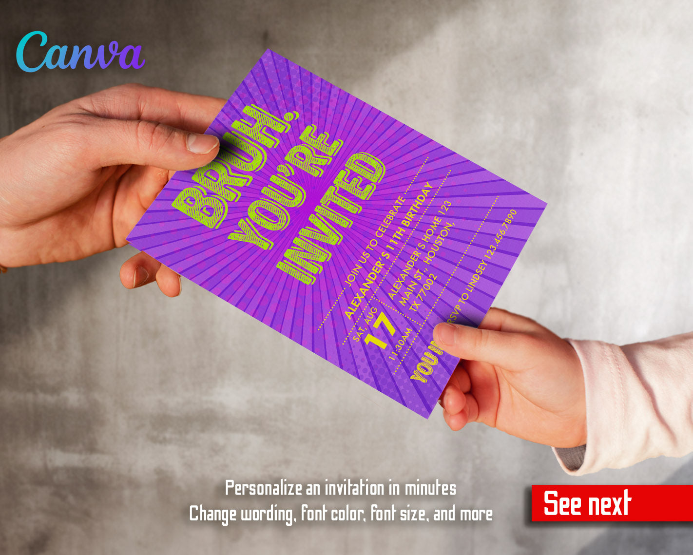 Related Tags: bro Birthday invite, Bruh Birthday Party, Bruh Invitation, Bruh Invite, dude fellow party, Boys bday party, Teenager Invitation, Teenager Invite, teens birthday, editable invitation, birthday invitation, printable invitation, invite template