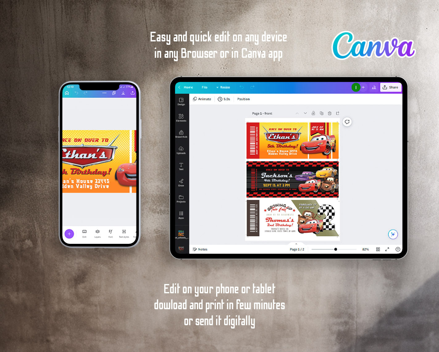 All the invitations are for self-editing. You will edit your template in Canva. It’s easy whether you're using the web browser or the app.