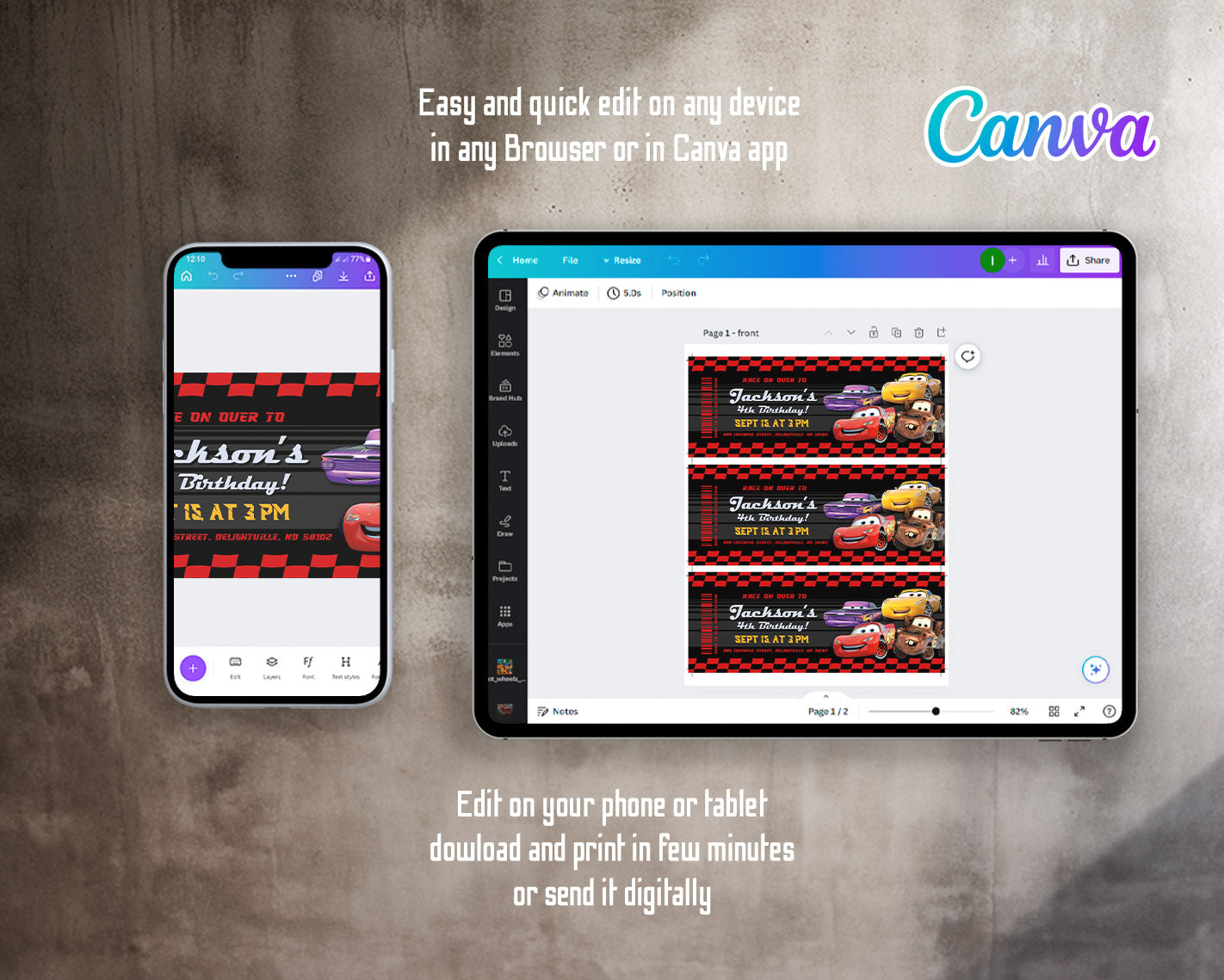 Printable Editable customizable Cars Lightning McQueen birthday party invitation digital template. Instant download invite.
