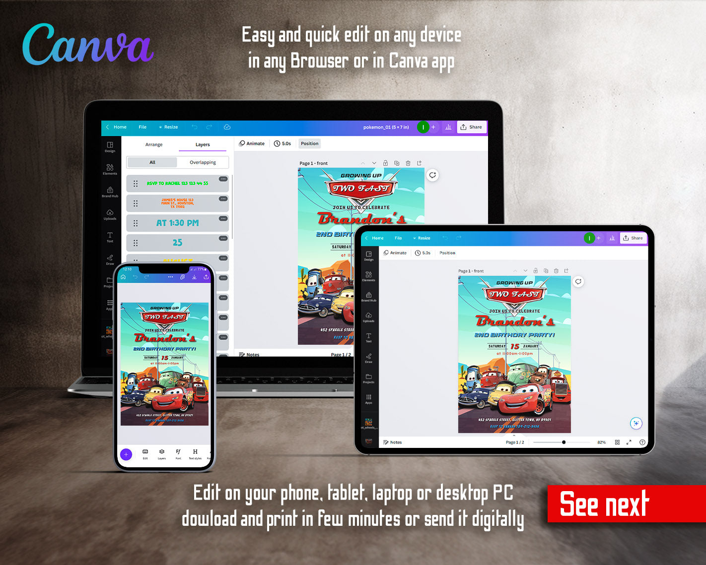 Related Tags: cars invitation, cars birthday, Lightning Mcqueen, Mcqueen invitation, racing party, second birthday, editable invitation, birthday invitation, printable invitation, invite template, two fast, boy birthday, speed race bday
