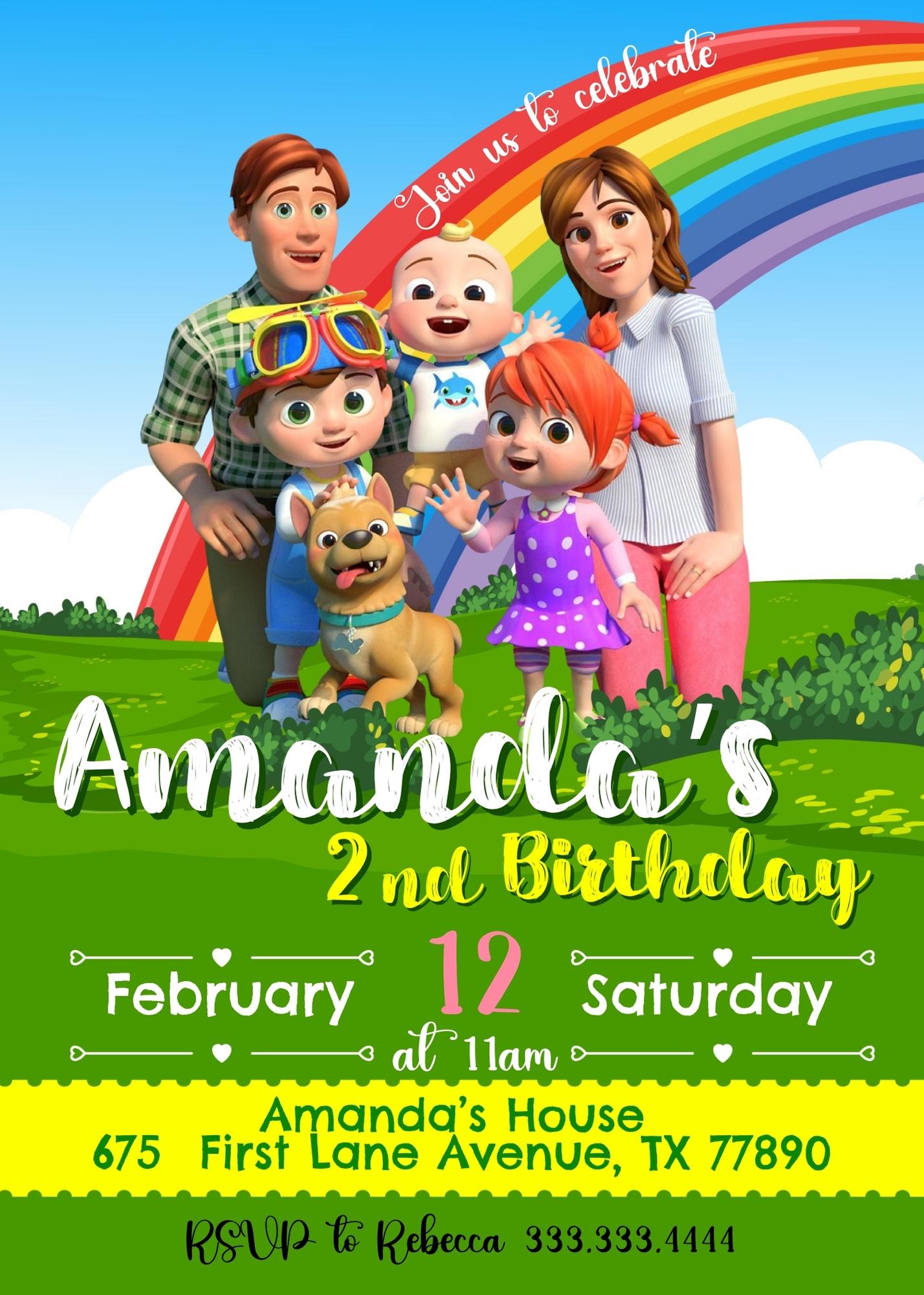 Related Tags: cocomelon invitation, cocomelon birthday, cocomelon invite, first invitation, cocomelon party, digital invite, editable invitation, birthday invitation, printable invitation, invite template, evite, girl birthday, boy birthday