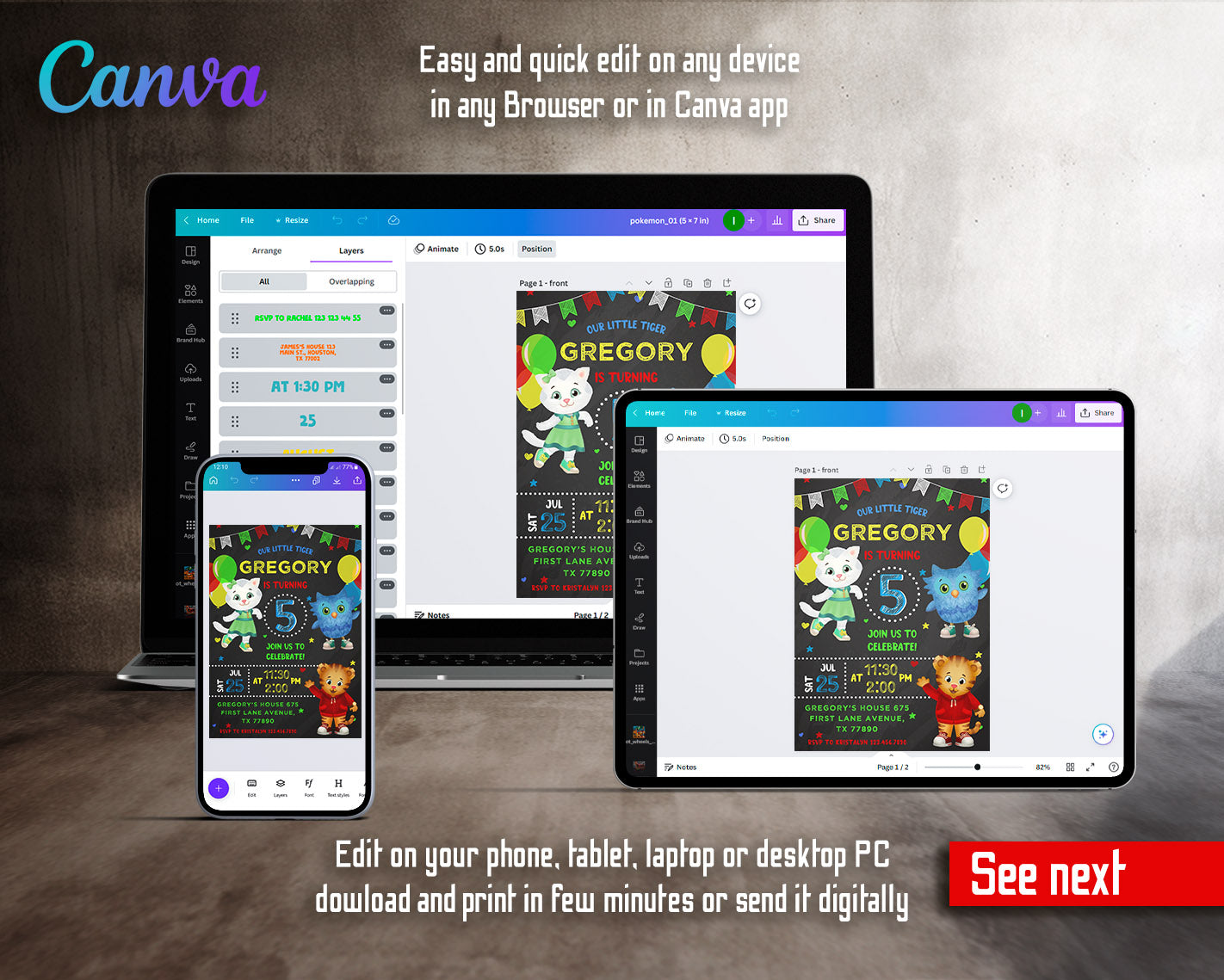 Related Tags: daniel tiger invite, daniel neighborhood, daniel invitation, tiger invitation, daniel tiger party, digital invite, editable invitation, birthday invitation, printable invitation, invite template, evite, girl birthday, boy birthday