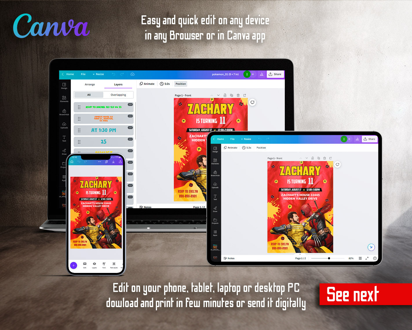Related Tags: deadpool birthday, Wolverine invite, marvel invitation, superhero party, movie party ticket, super hero invite, dead pool party, logan invitation, marvel comics bday, editable invitation, birthday invitation, printable invitation, invite template