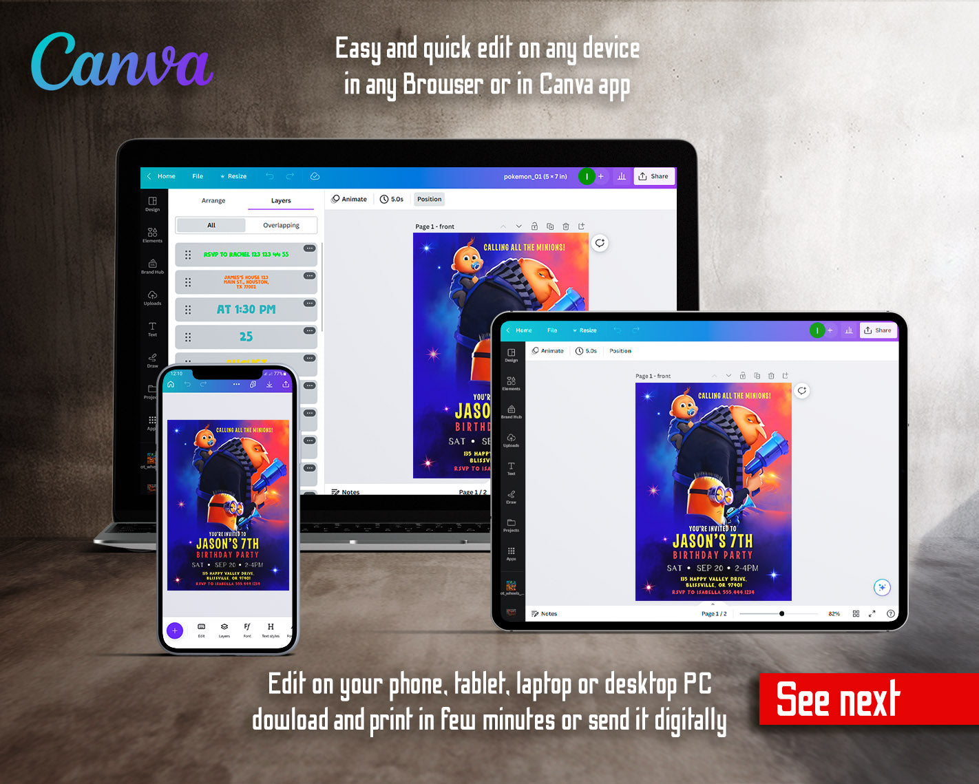 All the invitations are for self-editing. You will edit your template in Canva. It’s easy whether you're using the web browser or the app.