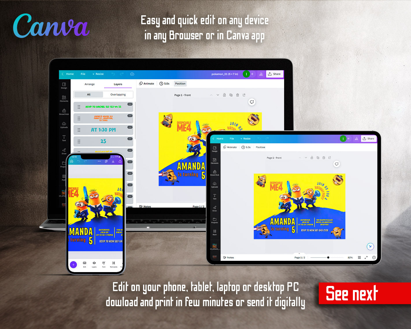 Printable Editable customizable Despicable Me Minions birthday party invitation digital template. Instant download invite.