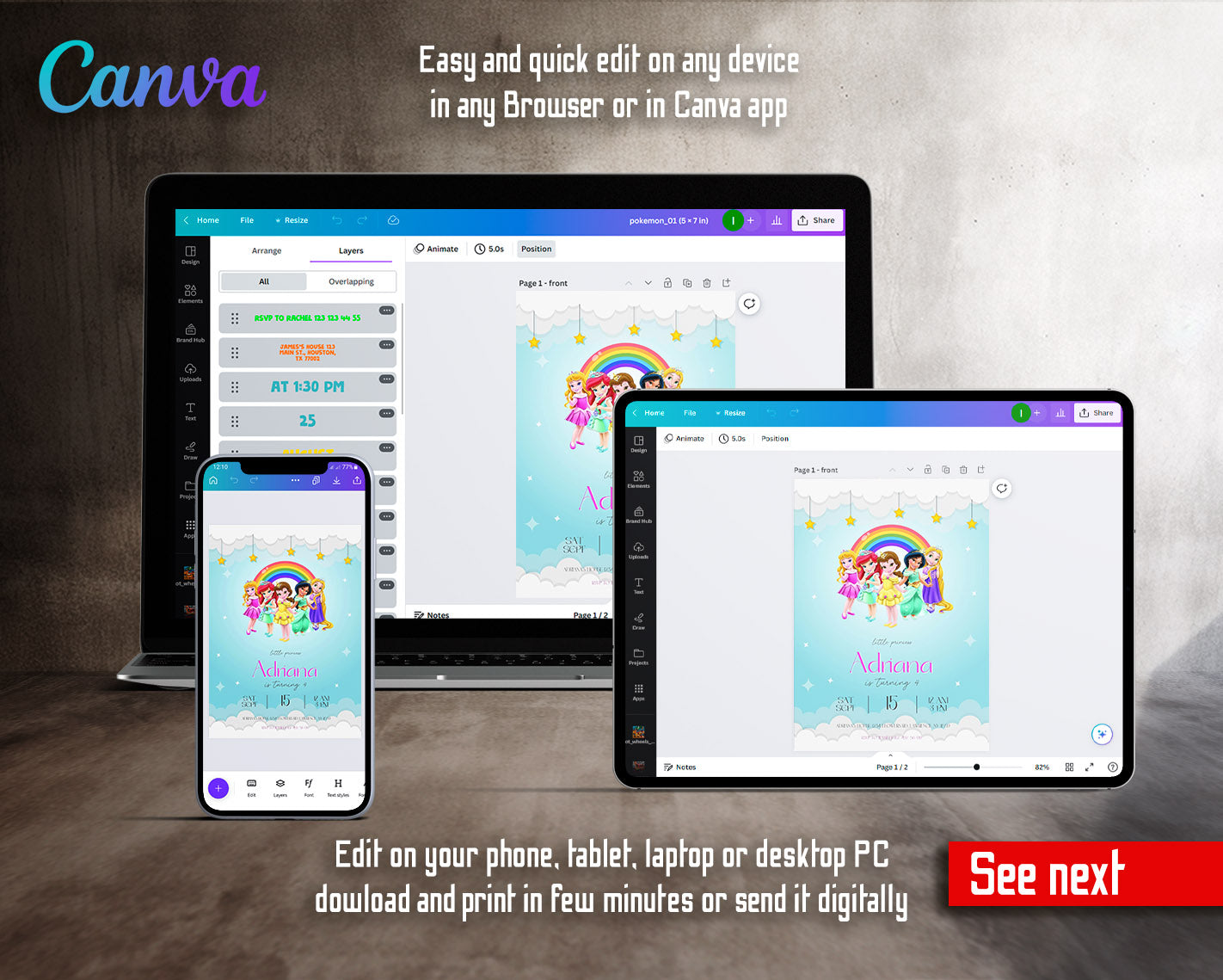 All the invitations are for self-editing. You will edit your template in Canva. It’s easy whether you're using the web browser or the app.