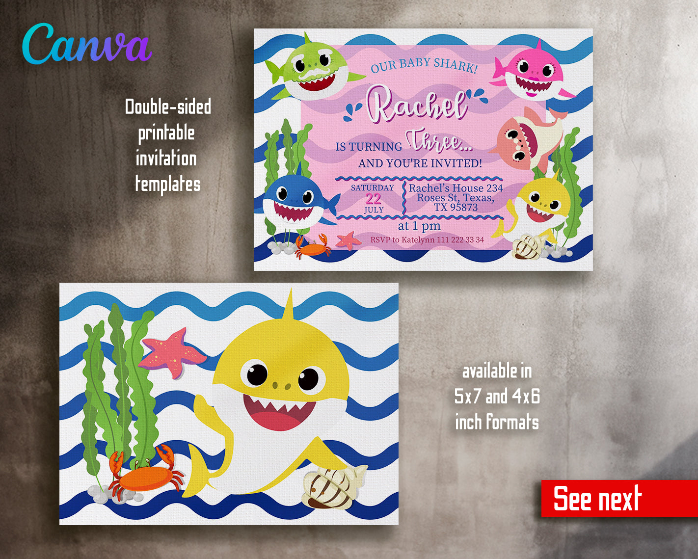 1. Invitation Template to edit in Canva ( 5" x 7" and 4" x 6" sizes), back design included;