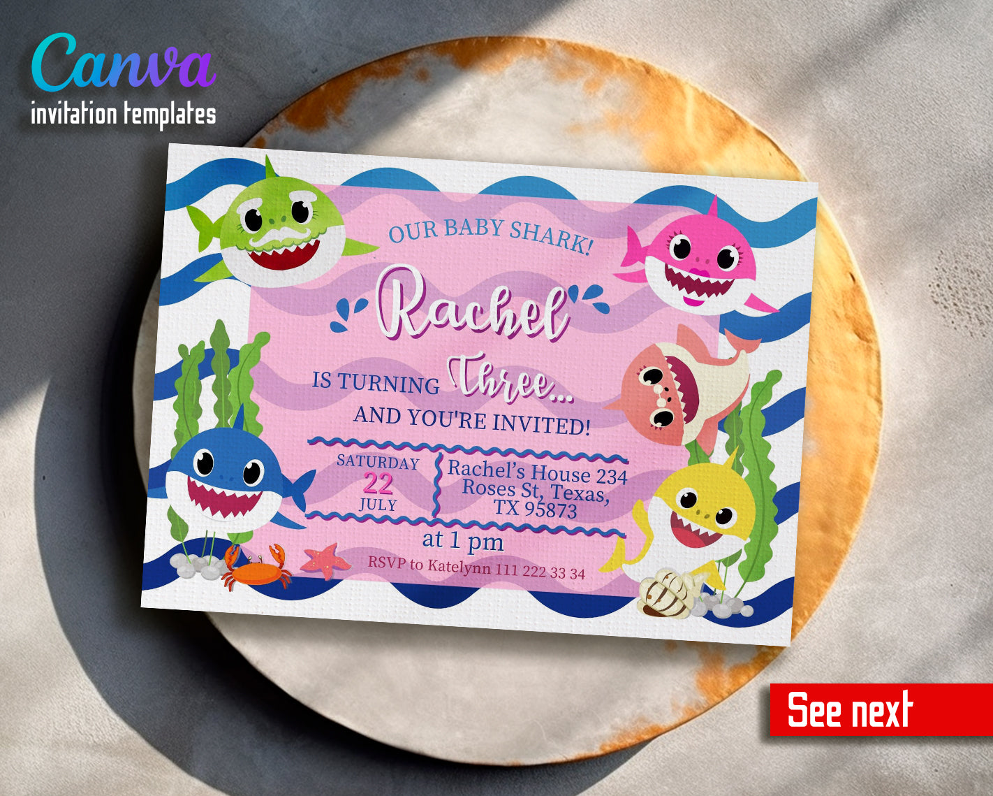 Baby Shark customizable invite template girl | instant download | Share or Print | ZU015