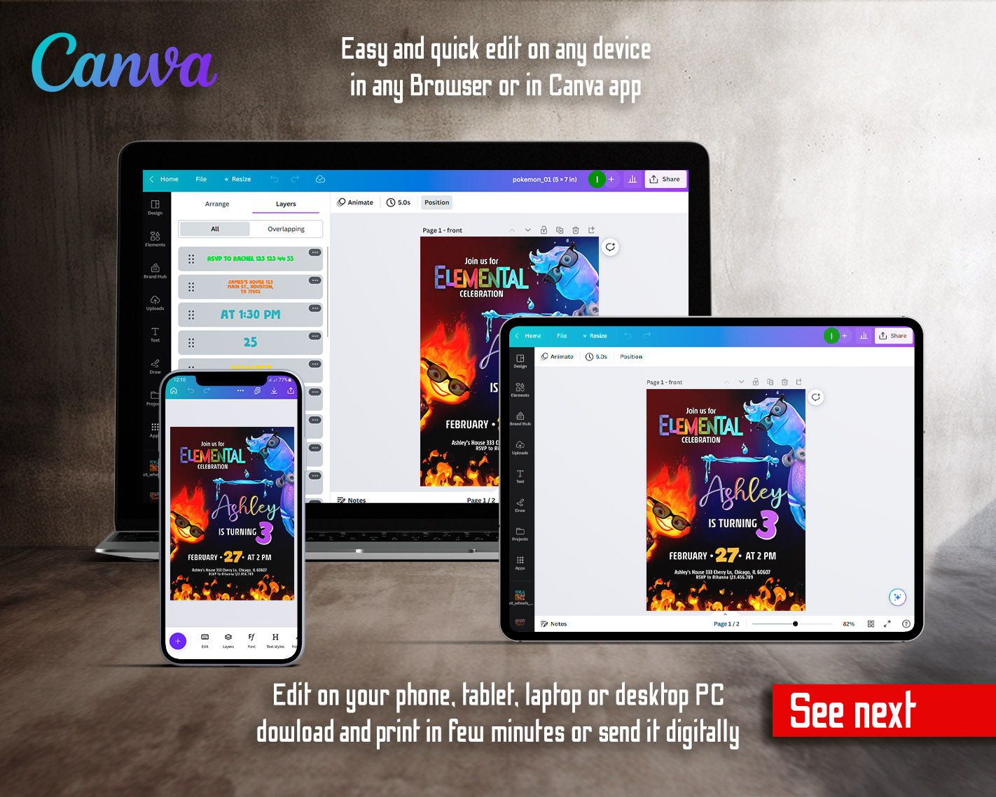All the invitations are for self-editing. You will edit your template in Canva. It’s easy whether you're using the web browser or the app.