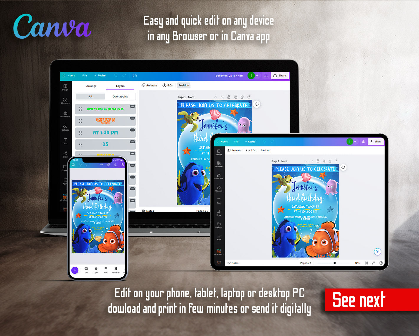 All the invitations are for self-editing. You will edit your template in Canva. It’s easy whether you're using the web browser or the app.