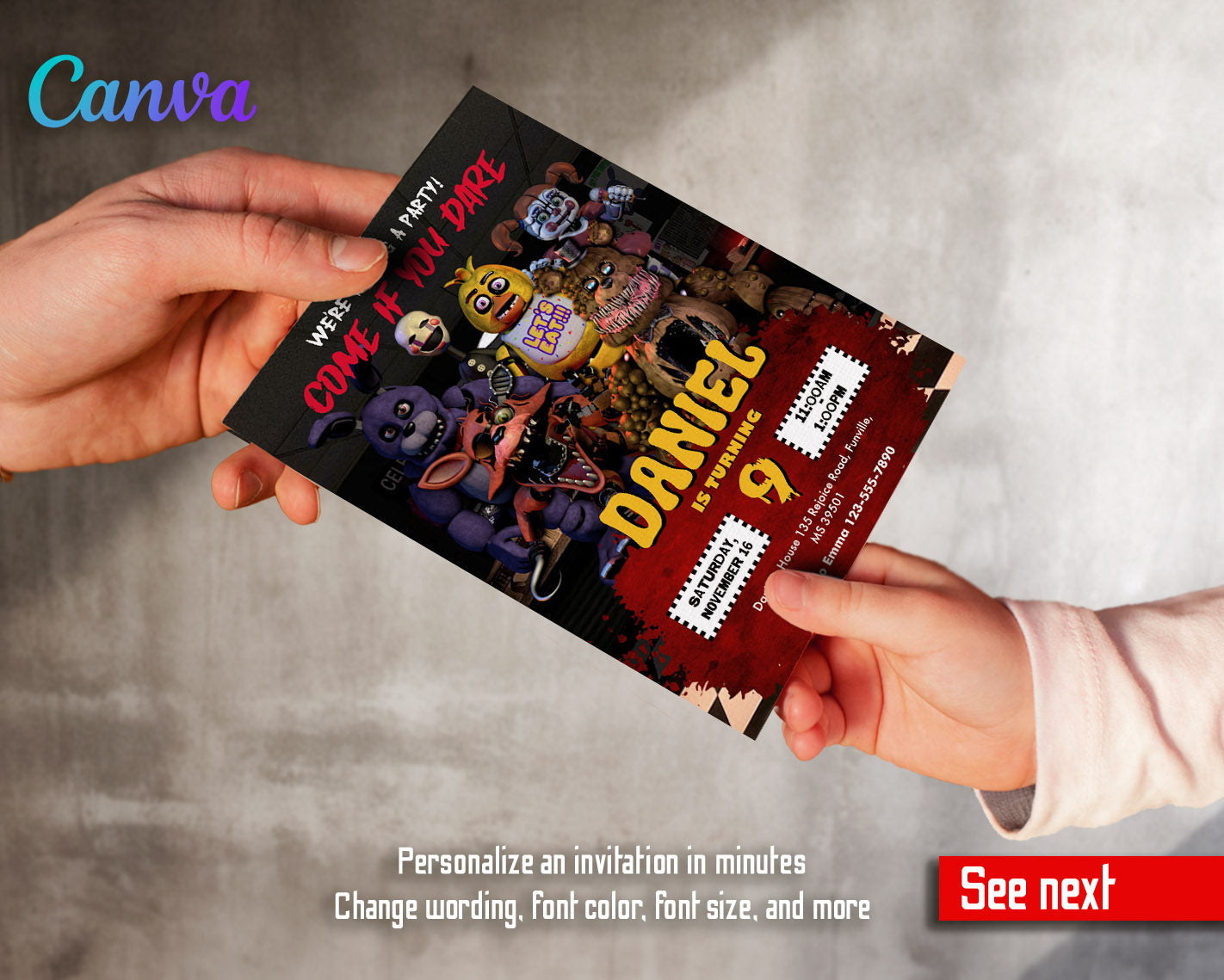 Printable Editable customizable Five Nights at Freddy's birthday party invitation digital template. Instant download invite.