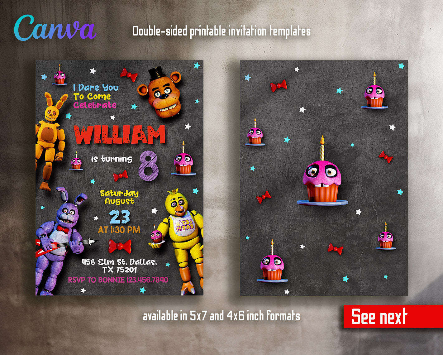 Related Tags: fivenight invitation, five nights birthday, five nights invite, freddy invitation, five nights party, fnaf invite, five nights freddys, birthday invitation, printable invitation, invite template, video game party, girl birthday, boy birthday