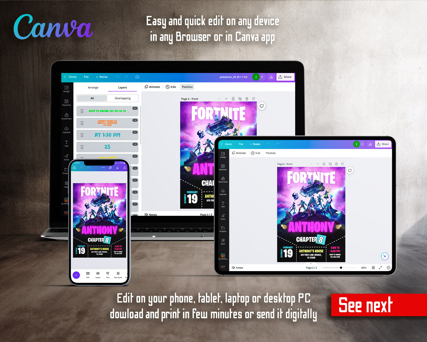 Related Tags: fortnite invitation, birthday invite, battle royale invite, fortnite marshmello, fort nite party, video game invite, editable invitation, birthday invitation, printable invitation, gamer invitation, battle bus, fortnites llama, boy birthday